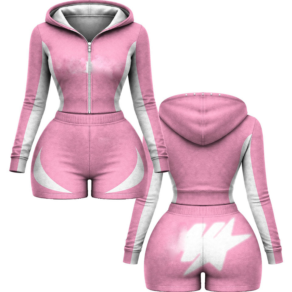ชุดเซ็ตบอดี้สูทขาสั้นผู้หญิง ผ้าโพลีเอสเตอร์ผสมสแปนเด็กซ์ พรีเมียม เนื้อผ้านุ่ม ยืดหยุ่น สีแดงขาว แต่งผ้าแบบแผง พร้อมเสื้อครอปฮู้ดดี้ กางเกงขาสั้น รับสกรีนโลโก้ ชุดบอดี้สูทขาสั้นผู้หญิง