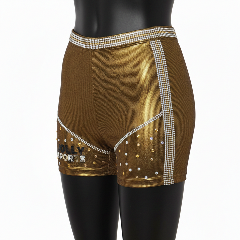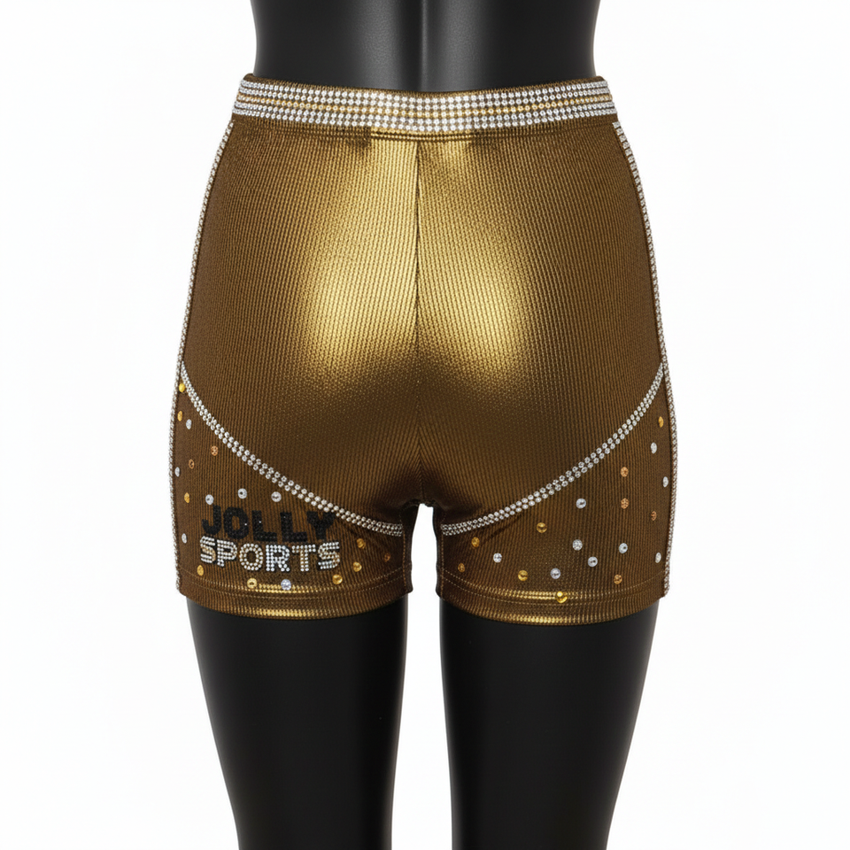 กางเกงขาสั้นผู้หญิง ผ้าโพลีเอสเตอร์ผสมสแปนเด็กซ์ แต่งผ้าเมทัลลิกสีทอง แถบข้างประดับคริสตัล โลโก้แบบรีดร้อน