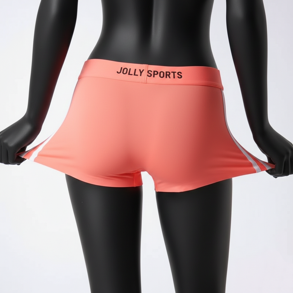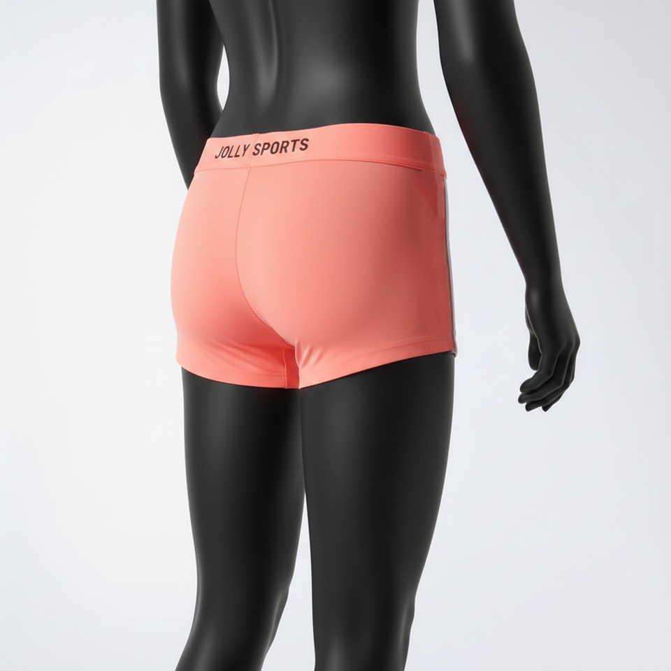 กางเกงขาสั้นบู้ตี้สำหรับผู้หญิง ผ้าโพลีเอสเตอร์ผสมสแปนเด็กซ์ ยืดหยุ่นได้ พรีเมียม GSM สีส้มคอรัล พิมพ์ลายโลโก้ด้วยความร้อนตามสั่ง