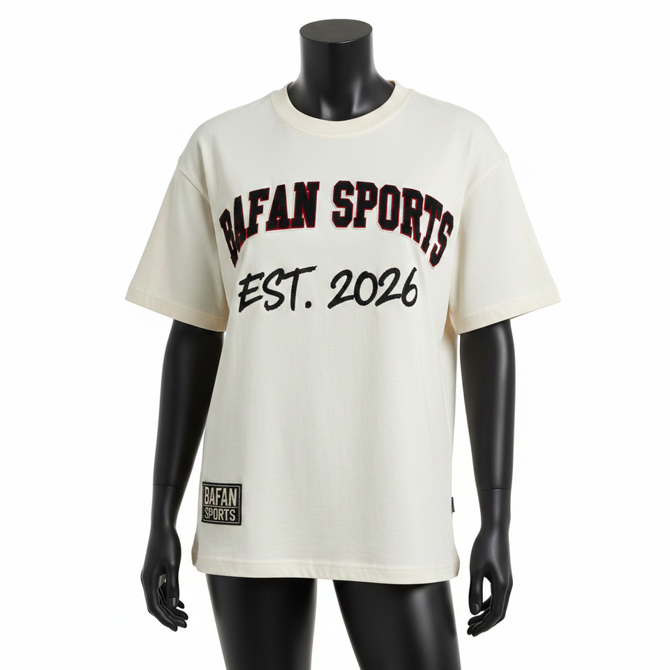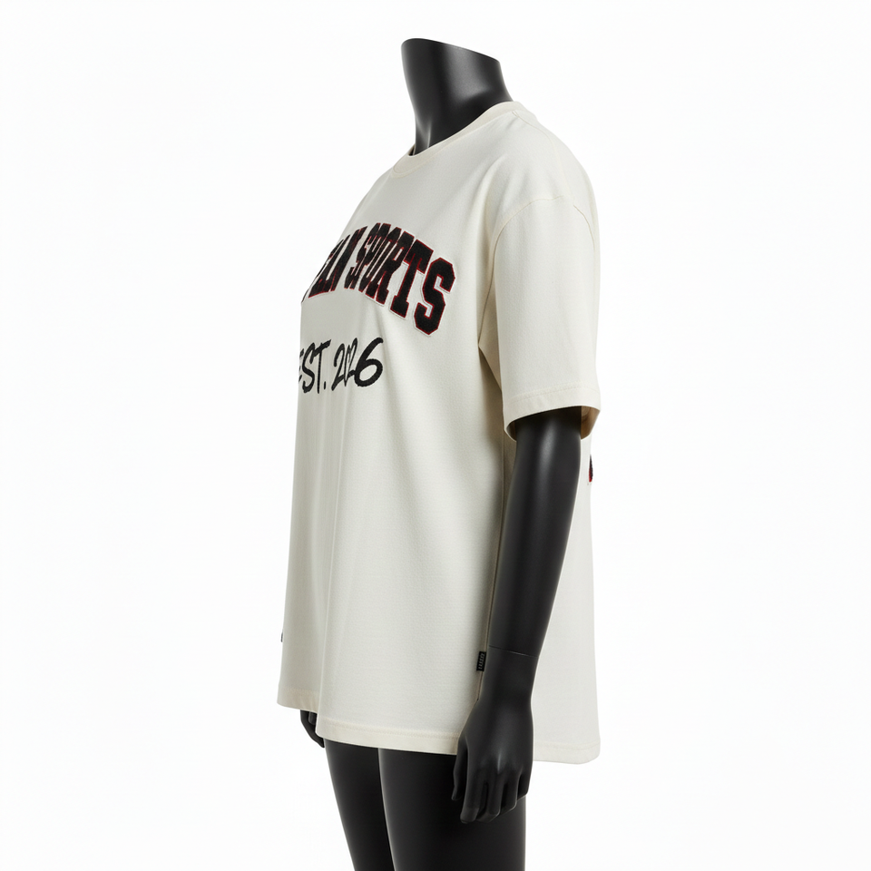 เสื้อยืดทรงบ็อกซี่สำหรับผู้หญิง ผ้าคอตตอนเจอร์ซีย์เนื้อหนัก GSM สีครีม ทรงโอเวอร์ไซส์ สไตล์สตรีท พิมพ์ลายสกรีน ปักลายผ้าทอ เสื้อยืดทรงบ็อกซี่สำหรับผู้หญิง ผ้าคอตตอน