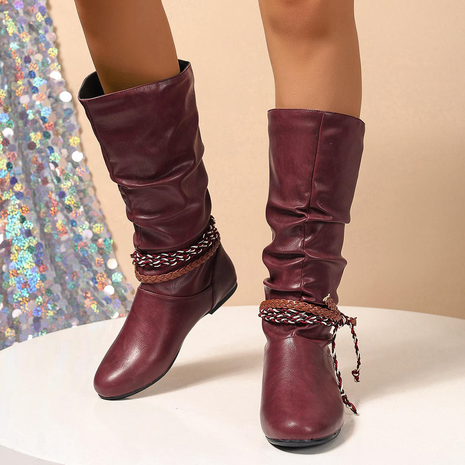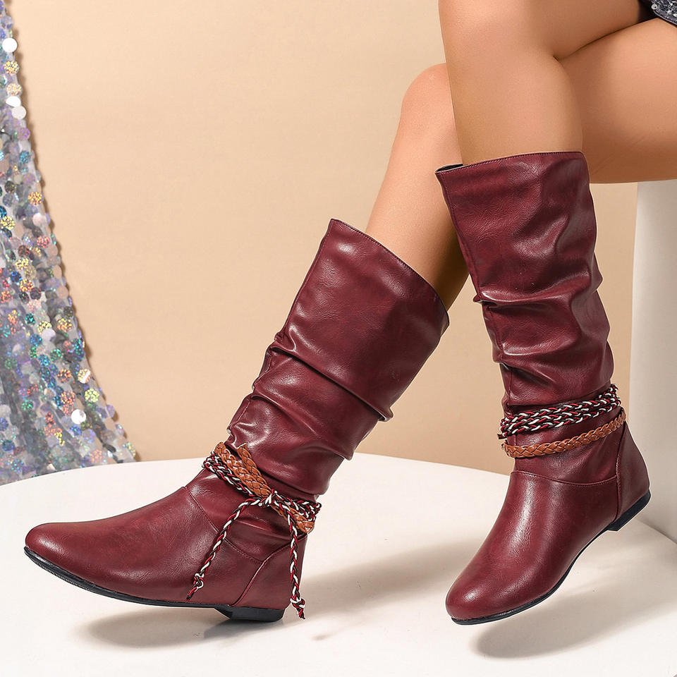 รองเท้าบูทผู้หญิงแบบถักเปีย แต่งระบาย ปลายมน ส้นแบน ความยาวครึ่งน่อง ดีไซน์เฉพาะตัว สวมใส่สบาย ใช้งานได้หลากหลาย เหมาะสำหรับเดินทาง ปาร์ตี้ วันหยุด และแฟชั่น