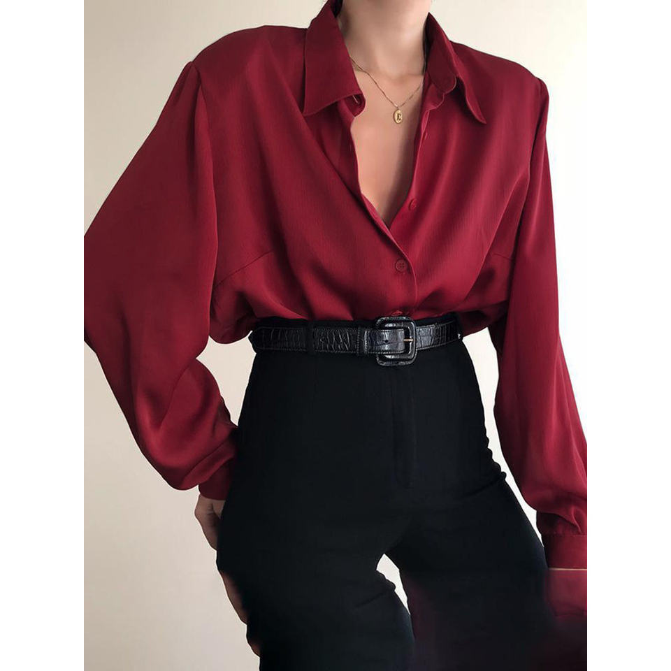 เสื้อเบลาส์ลำลองสำหรับผู้หญิง แขนยาว ทรงหลวม ปกติดกระดุม สีแดง/ไวน์/ดำ