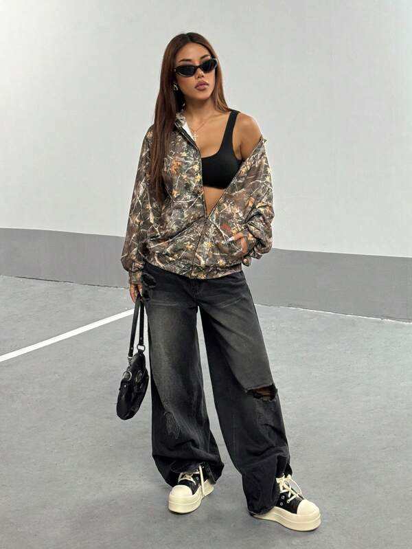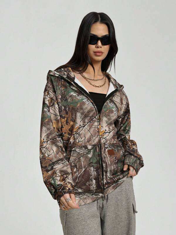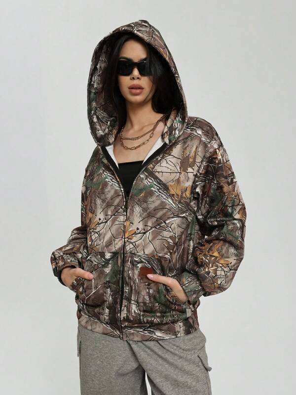 เสื้อฮู้ดมีซิปลายพรางสำหรับผู้หญิงเสื้อสเวตเตอร์แขนยาวพิมพ์ลายป่าแบบลำลองเสื้อสวมหัวโลโก้ออกแบบได้ตามต้องการ
