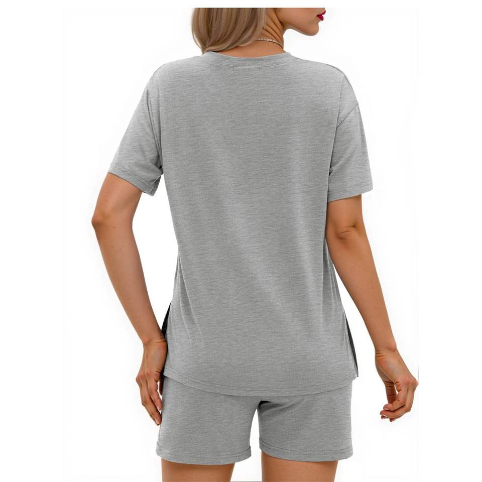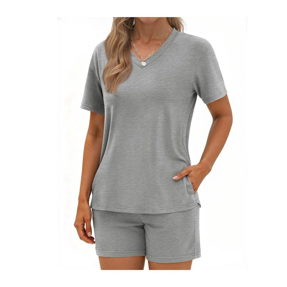 ชุดลำลองผู้หญิง 2 ชิ้น เสื้อยืดคอวีและกางเกงขาสั้น ชุดผ้าฝ้ายนุ่มใส่สบายสำหรับฤดูร้อน ชุดเข้าชุด ขายส่ง OEM ชุดแฟชั่นทันสมัย