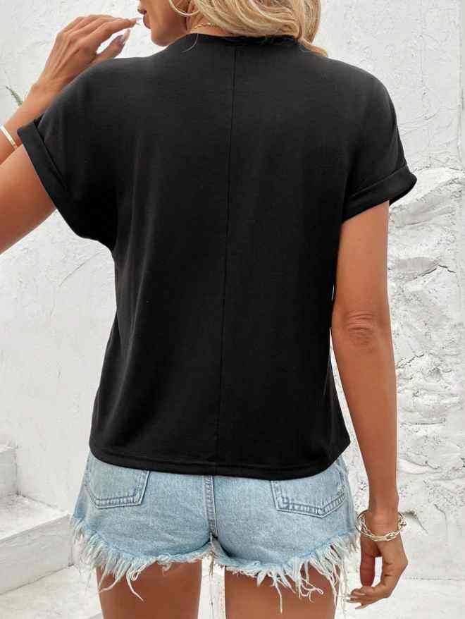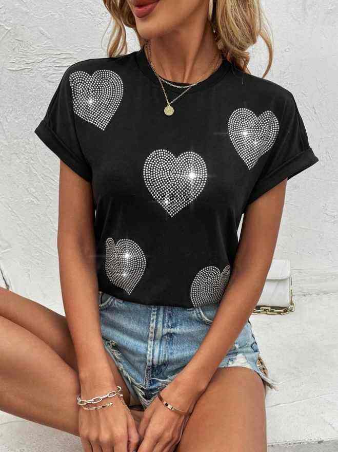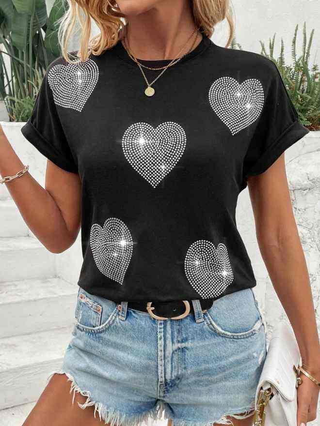 เสื้อยืดผู้หญิง คอกลม แขนครึ่ง ผ้าโพลีเอสเตอร์ผสมคอตตอน ระบายอากาศได้ดี ไม่ยับง่าย เป็นมิตรต่อสิ่งแวดล้อม เหมาะสำหรับฤดูใบไม้ผลิและฤดูร้อน ตกแต่งด้วยคริสตัล