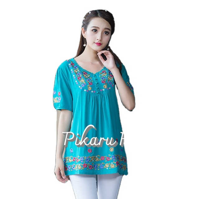 ชุดเดรสปักลายดอกไม้สำหรับผู้หญิง,ชุดเดรสแฟชั่นคอวีแขนสั้นลำลองงามสง่าด้านบน