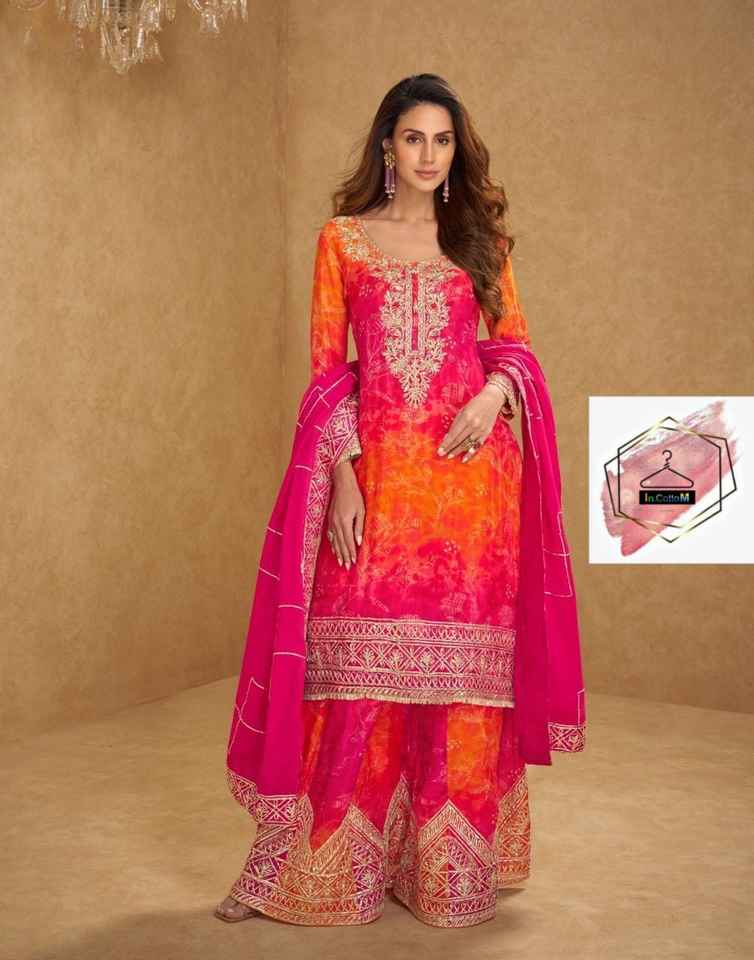Women Chinon Silk Embroidery Work Kurta with Sharara & Dupatta Heavy Embroidery Ribin Gota Work Top With Embroidered Dupatta