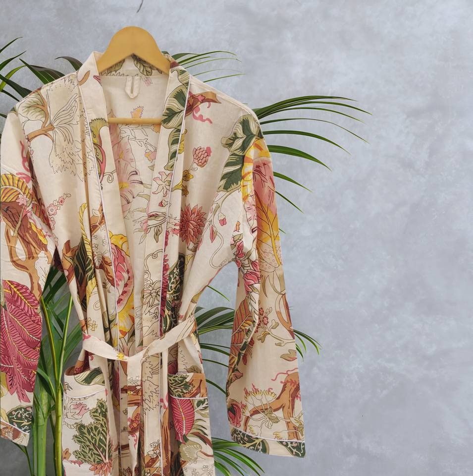 เสื้อคลุมสไตล์กิโมโนผ้าฝ้ายลายวาฟเฟิลพิมพ์ลายดอกไม้แขนยาวนุ่มน้ำหนักเบาเสื้อคลุมอาบน้ำฤดูร้อนชุดลำลองที่สวมใส่สบาย