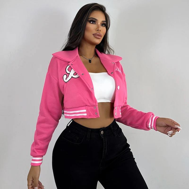 เสื้อโค้ทแจ็กเก็ตผ้าฝ้ายลำลองสำหรับผู้หญิง, เสื้อแจ็กเก็ตเบสบอลมีกระดุมดีไซน์แบบถักแฟชั่นเสื้อเอวลอย