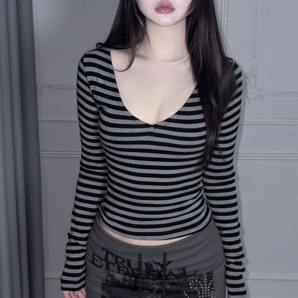 เสื้อยืดแขนยาวโชว์หลังลายบล็อกสีสำหรับผู้หญิงเสื้อยืด Y2K ถักทรงสลิมฟิตลำลองแนวสตรีทแฟชั่นฤดูใบไม้ร่วง