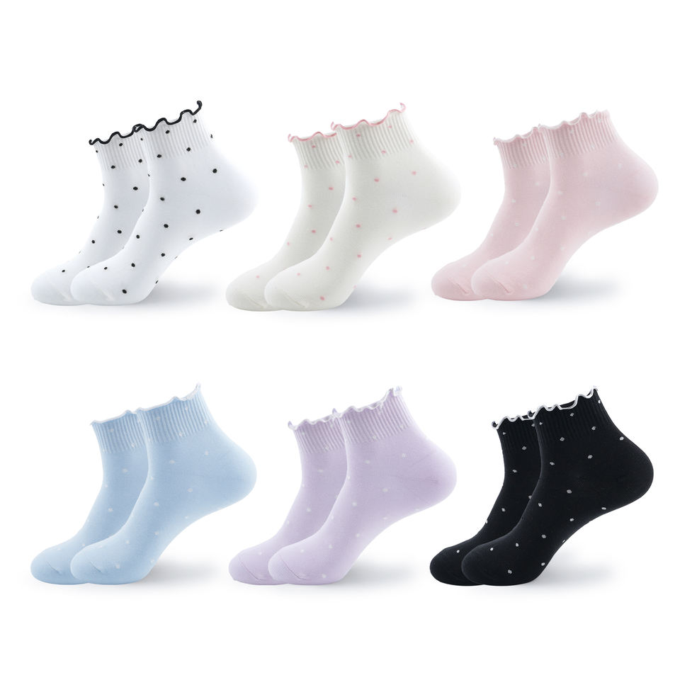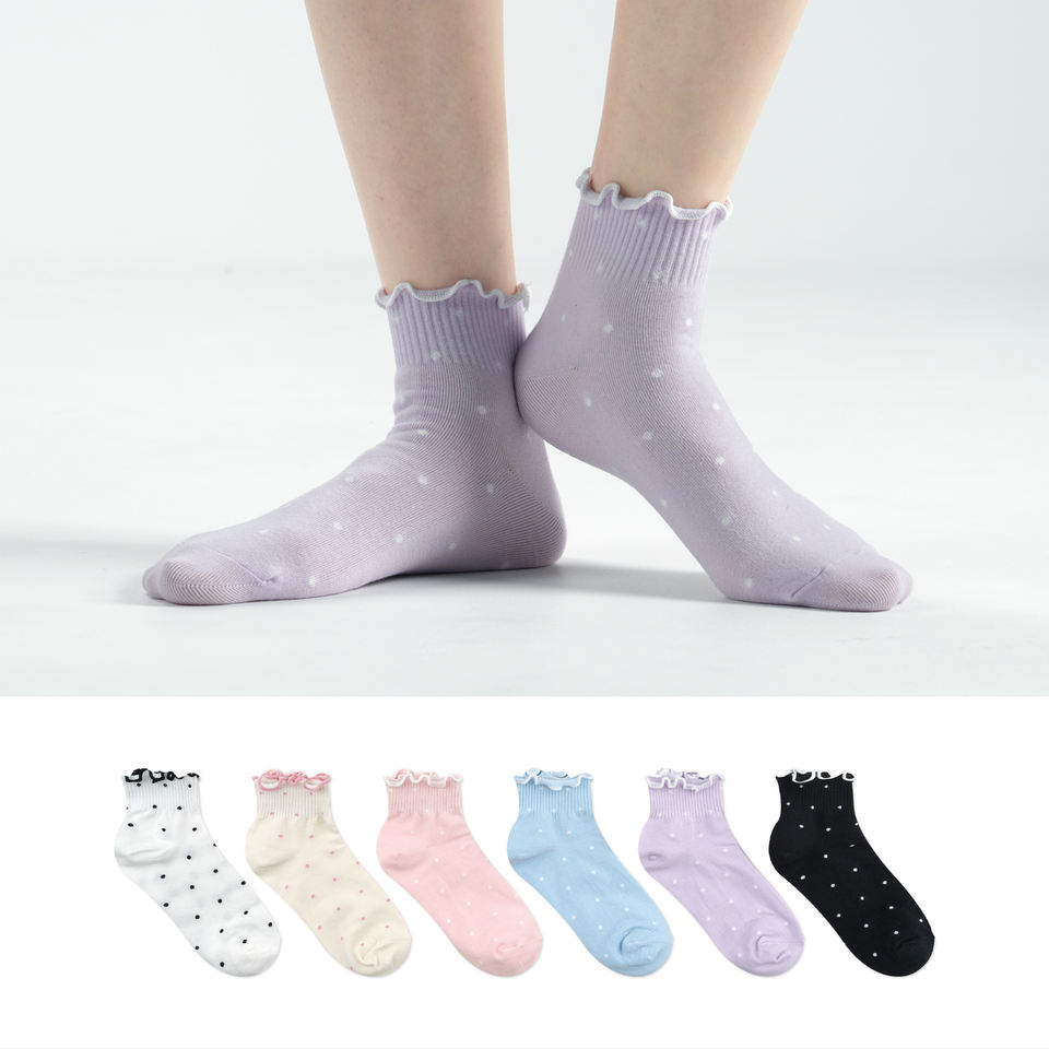 Women Eco-Friendly Cotton Ankle Socks-Polka Dots Pattern Pastel Color Ruffle Design Korean Daily Socks-Kikiya