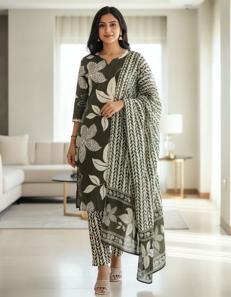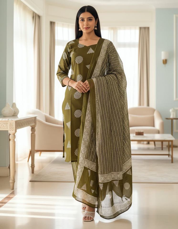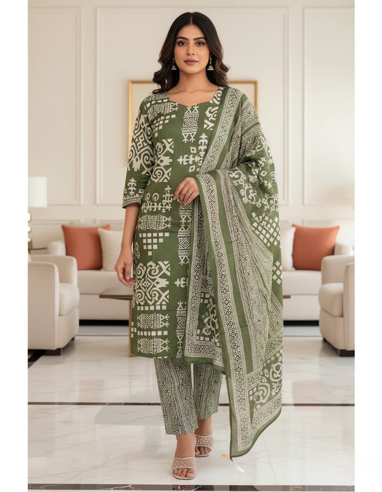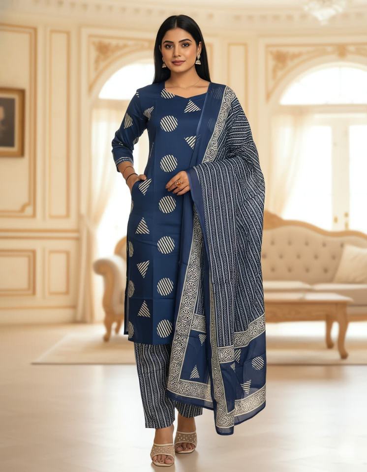 ชุดเซ็ตสามชิ้นผ้าฝ้ายเซรามิกสำหรับผู้หญิง 60-60 ลายพิมพ์แบบดั้งเดิมสำหรับงานปาร์ตี้ เสื้อคุर्ตา กางเกงขายาว ผ้าคลุมไหล่ สไตล์ลำลอง ชุดพื้นเมือง คุณภาพส่งออก