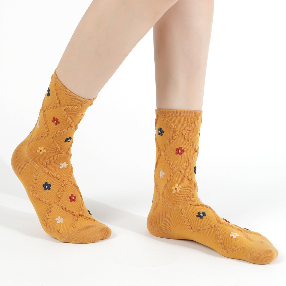ถุงเท้าผ้าฝ้ายผู้หญิง - ลายกราฟิกดอกไม้เล็กๆ ดีไซน์ลายดอกไม้น่ารัก สไตล์เกาหลี ระบายอากาศได้ดี ถุงเท้าลำลอง - ลายดอกไม้ B