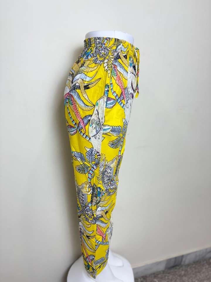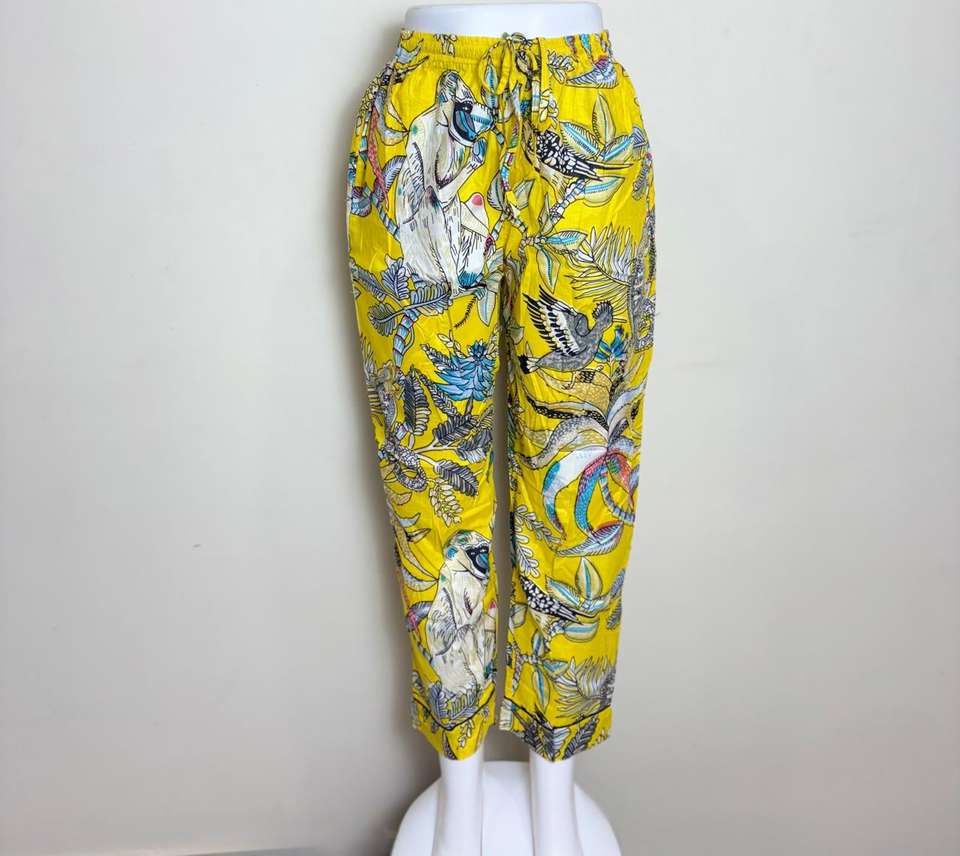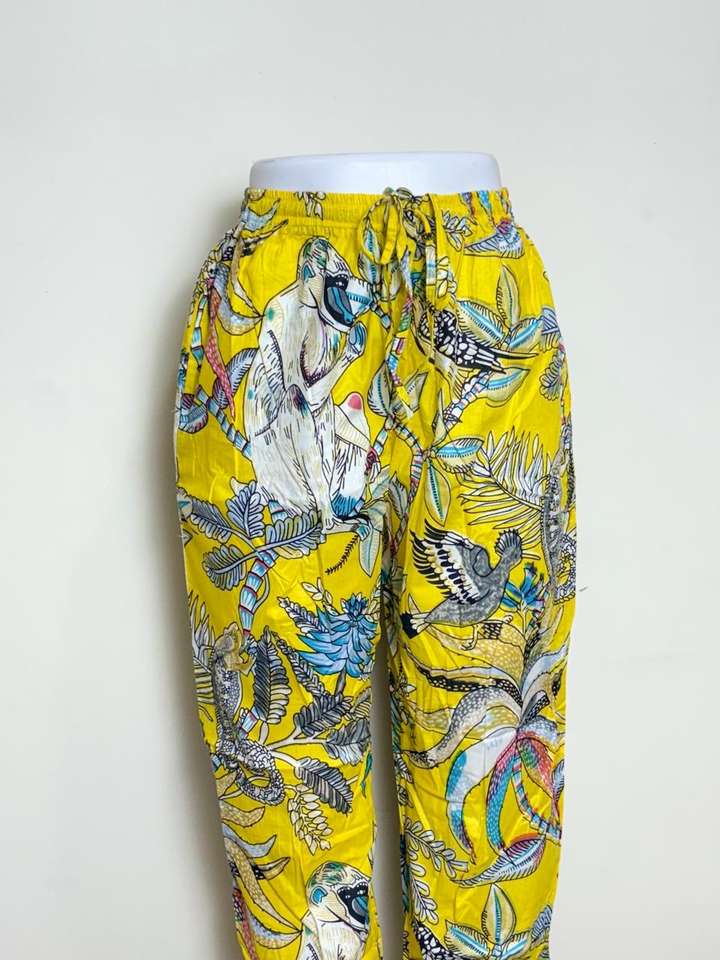 ชุดนอนผ้าฝ้ายพิมพ์ลายสีเหลืองสำหรับผู้หญิงกางเกงลำลองผ้าฝ้ายพิมพ์ลายนกดีไซน์เขตร้อนสีเหลืองสำหรับผู้หญิง