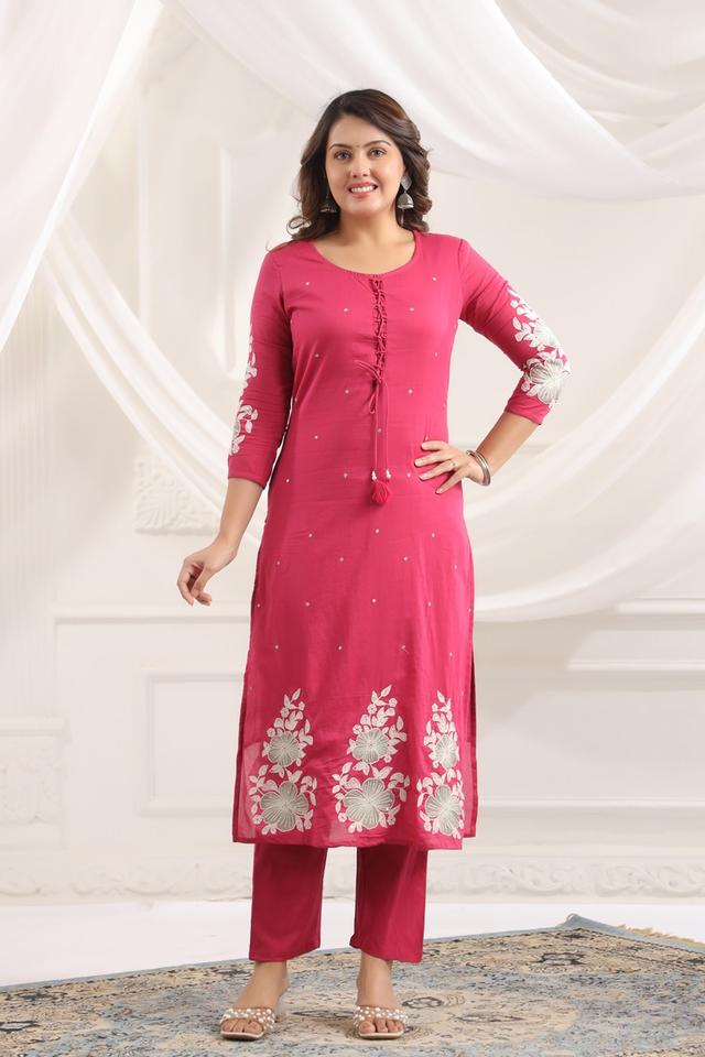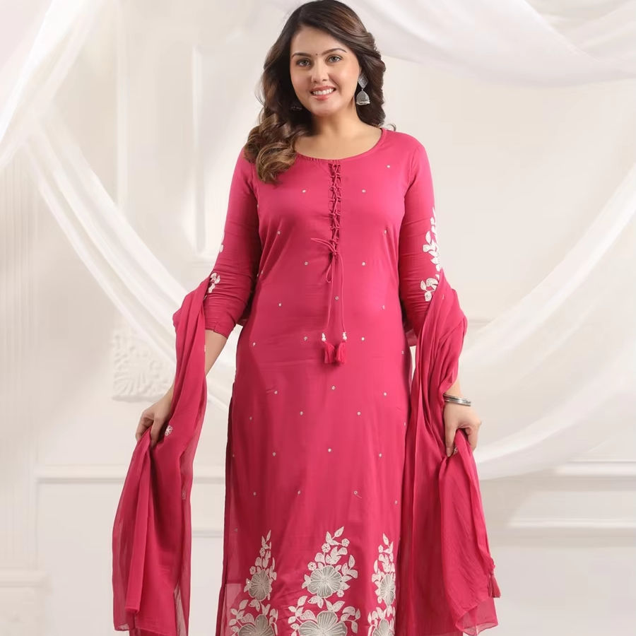 ชุดคุर्ติผ้าฝ้ายผสมไหมปักเลื่อมสำหรับผู้หญิง พร้อมกางเกงและผ้าคลุมไหล่ | เสื้อคอกลมแขน 3/4 แบบดั้งเดิมสำหรับฤดูร้อน