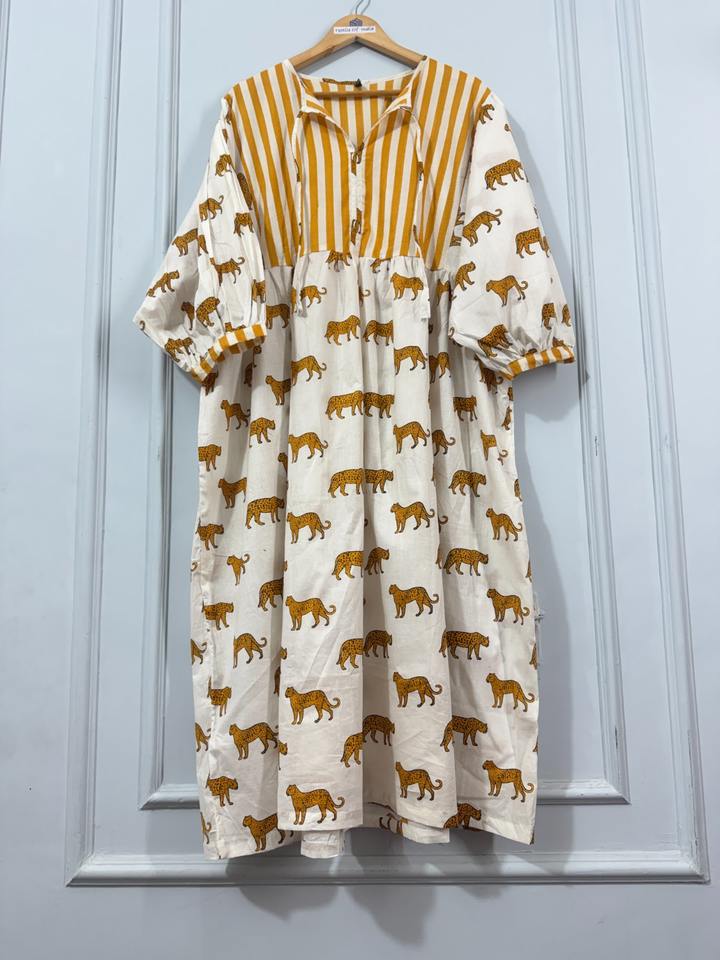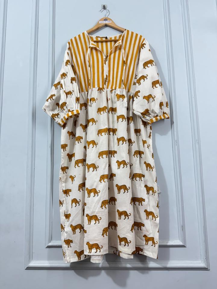 ชุดเดรสผ้าฝ้ายลายเสือสำหรับผู้หญิง ความยาวระดับเข่า แต่งแถบลายที่คอเสื้อ ทรงเข้ารูป สไตล์ชาติพันธุ์ โบโฮ เป็นมิตรกับสิ่งแวดล้อม ย้อมสีพื้น เหมาะสำหรับใส่ในฤดูร้อน สำหรับร้านบูติก