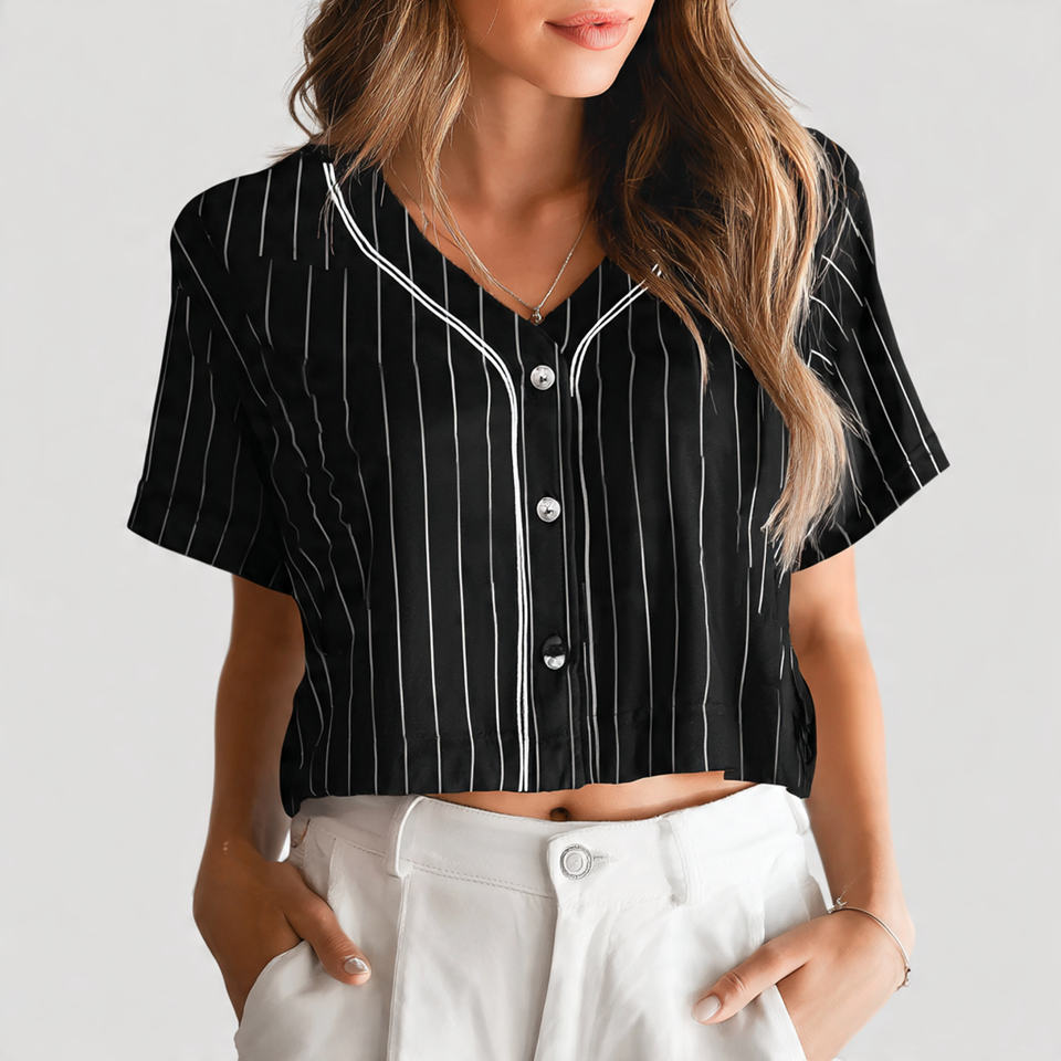 เสื้อเบสบอลครอปผู้หญิง ลายทาง แขนสั้น ติดกระดุม เสื้อเบสบอลครอปผู้หญิง ลายเส้น