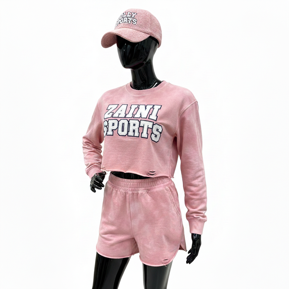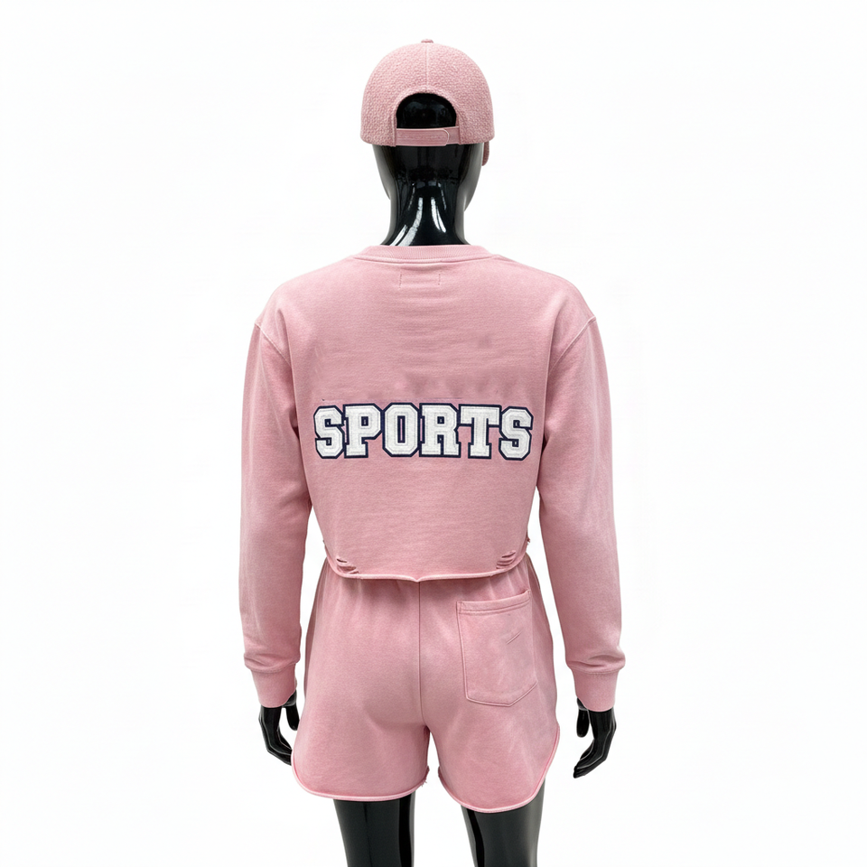 ชุดเซ็ตเสื้อครอปและกางเกงขาสั้นสำหรับผู้หญิง ผ้าคอตตอนผสมโพลีเอสเตอร์เนื้อฟลีซคุณภาพสูง 280 GSM สัมผัสนุ่ม สีชมพู แต่งโลโก้ด้วยเทคนิค Applique