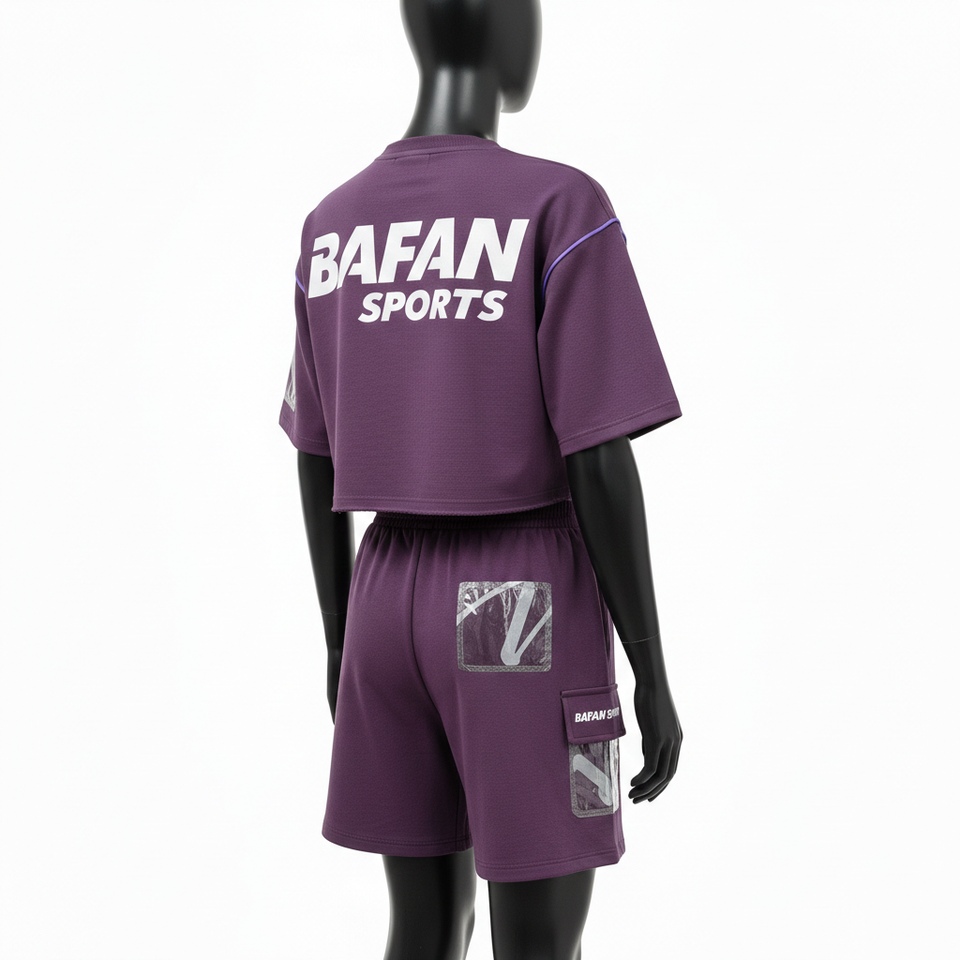 ชุดเซ็ตเสื้อครอปท็อปและกางเกงขาสั้นผ้าฝ้ายพรีเมียม GSM พร้อมแผ่น PVC สีม่วง พิมพ์ลายสกรีนโลโก้ตามสั่ง ผ้าฝ้าย 100%