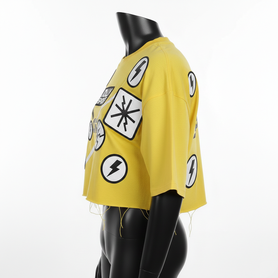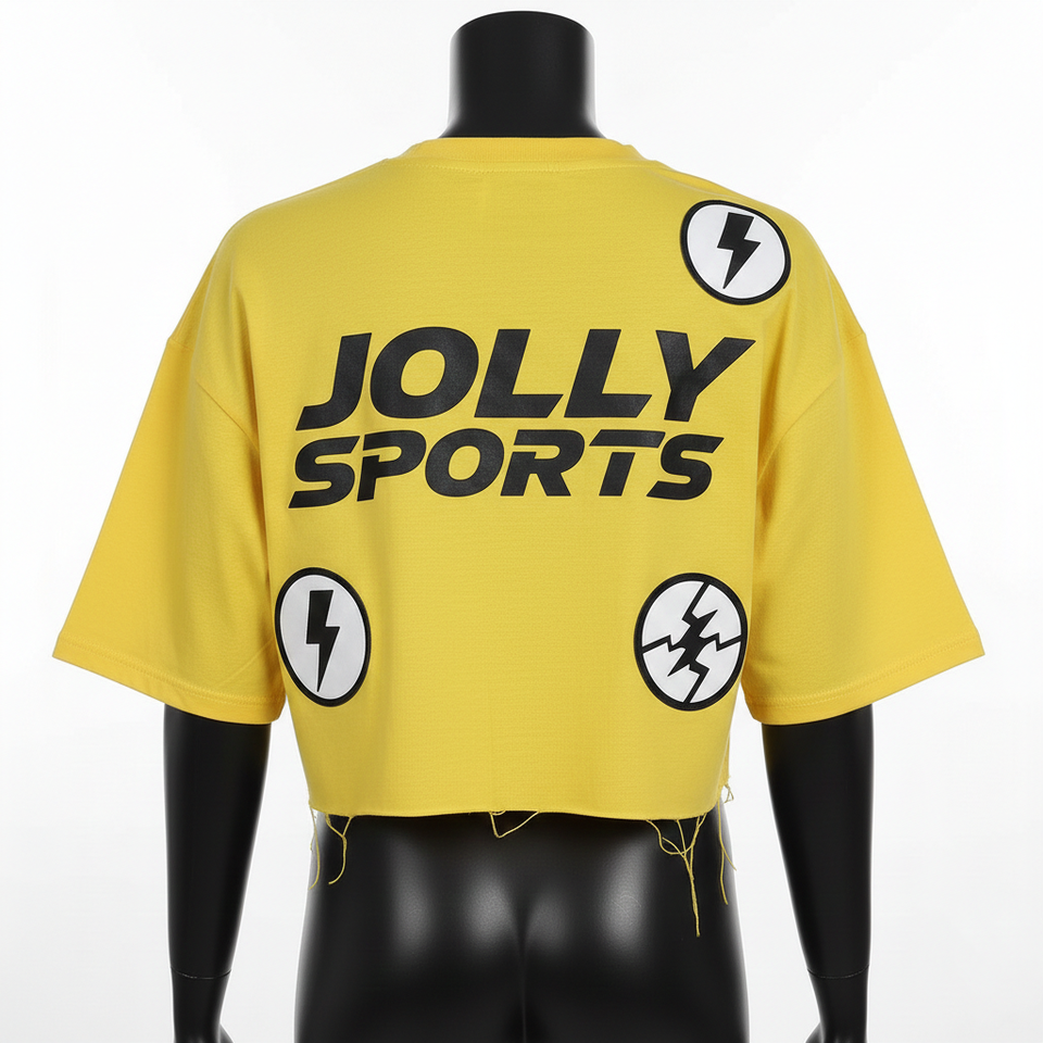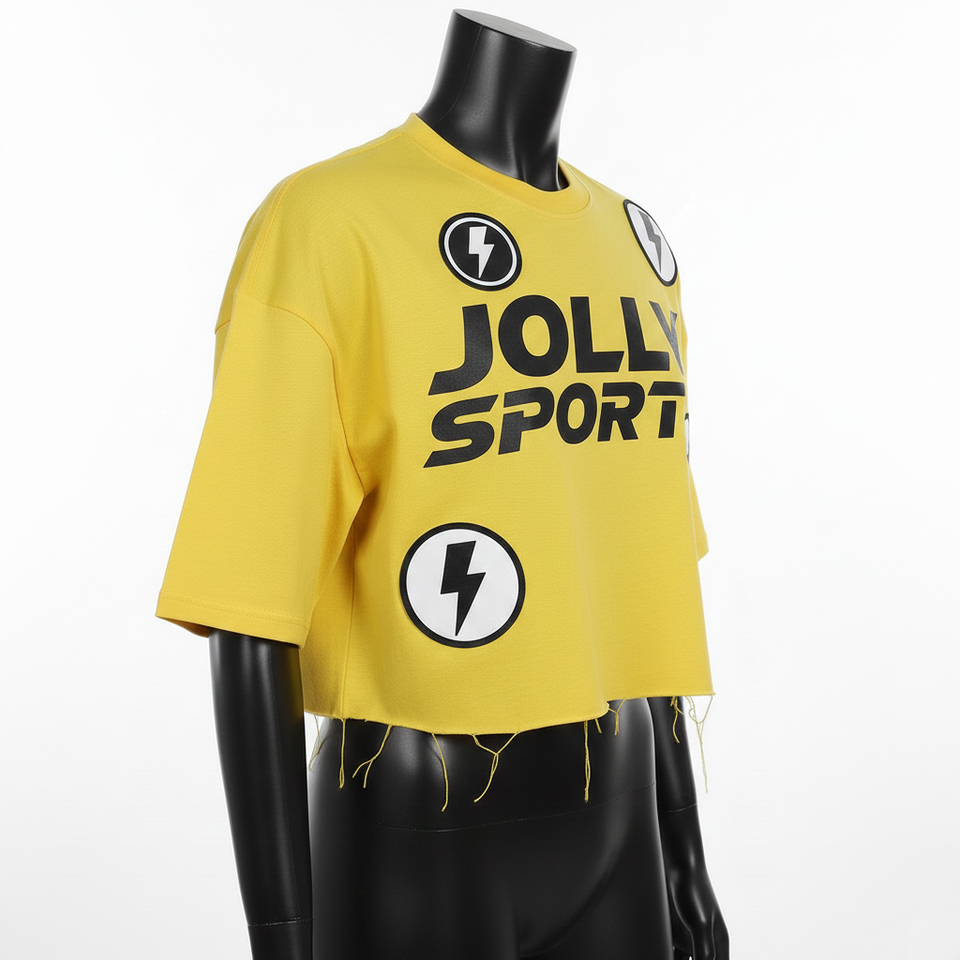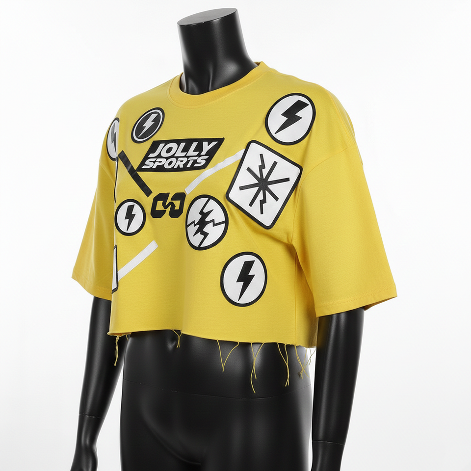 เสื้อครอปท็อปผู้หญิง ผ้าคอตตอนเจอร์ซีย์พรีเมียม GSM สีเหลือง พร้อมป้ายปักลาย โลโก้แบบรีดร้อน ระบายอากาศได้ดี เสื้อครอปท็อปผู้หญิง