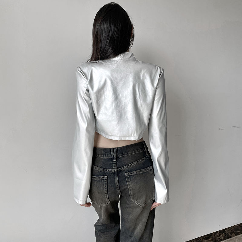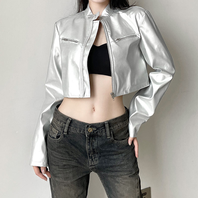 เสื้อแจ็คเก็ตหนังเทียมทรงครอปสำหรับผู้หญิง แบบซิป ทรงเข้ารูป สีพื้น สไตล์มอเตอร์ไซค์ เสื้อคลุมตัวนอกแบบสั้น