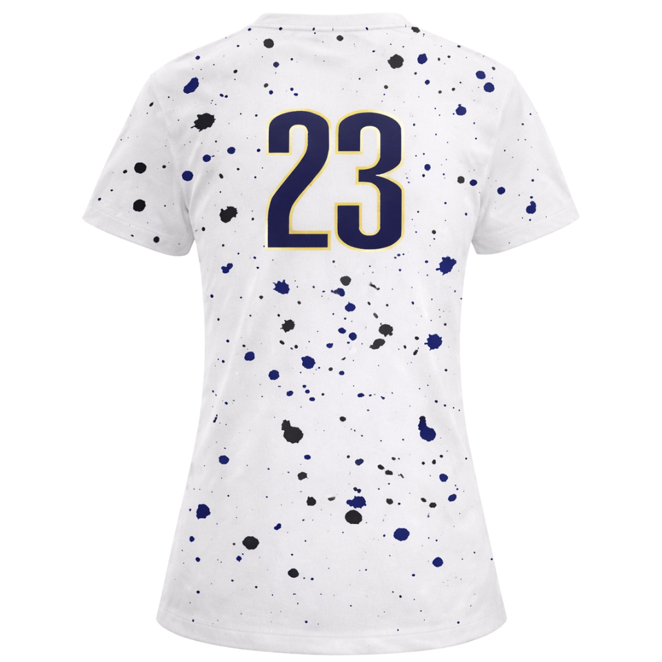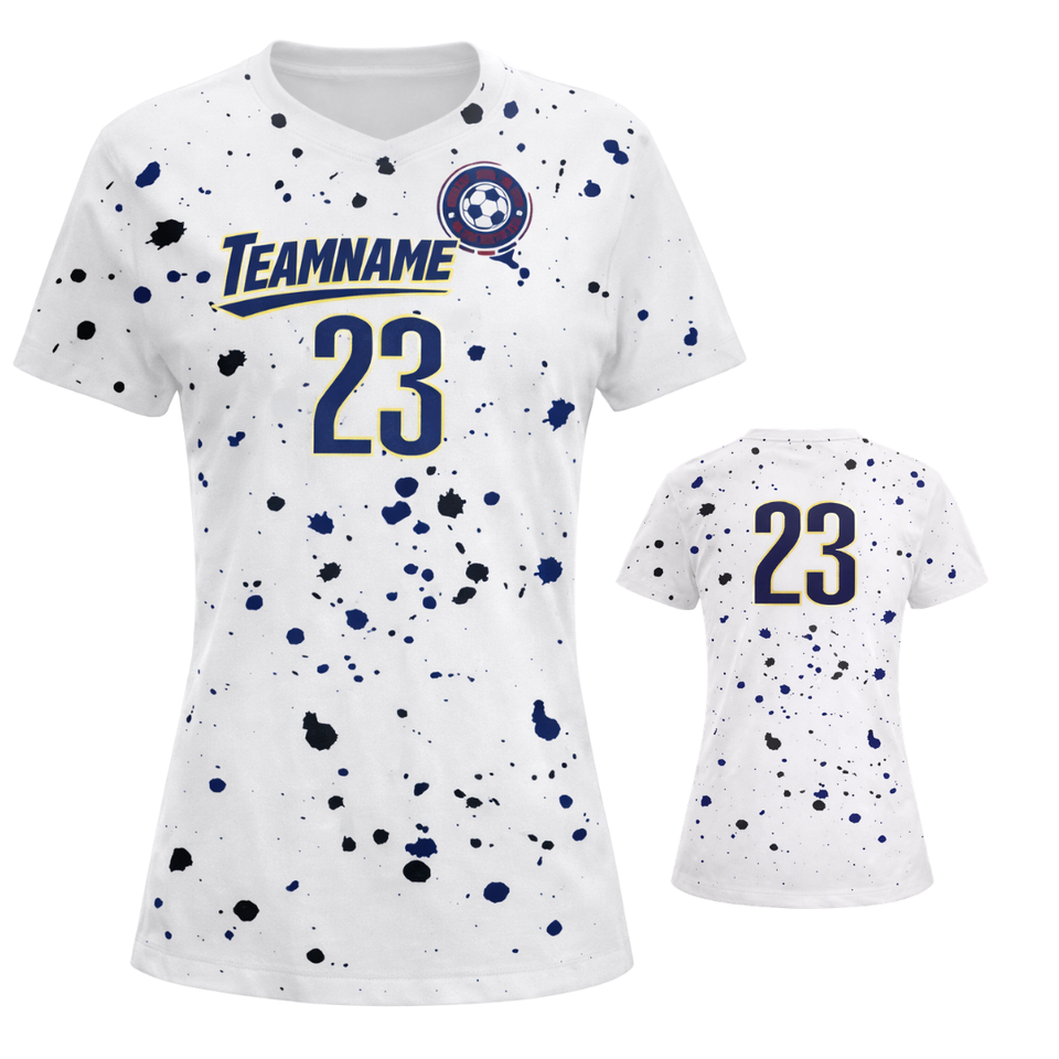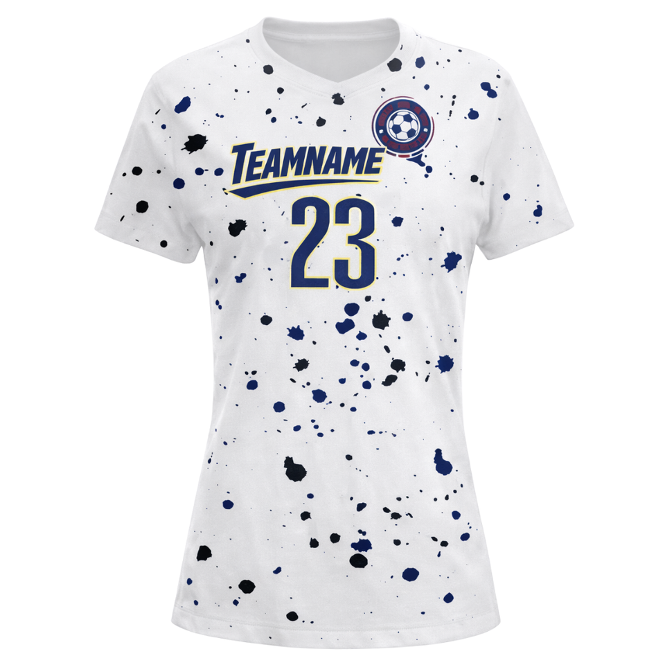 เสื้อฟุตบอลสีขาวแบบกำหนดเองสำหรับผู้หญิง ลายเพ้นท์สแปลช แขนสั้น ระบายอากาศได้ดี แห้งเร็ว ชุดยูนิฟอร์มทีมฟุตบอลหญิง