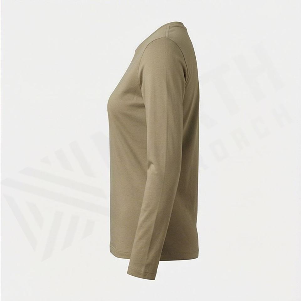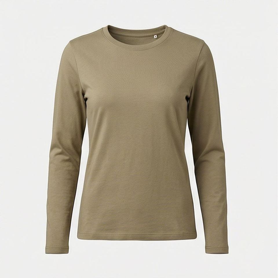 เสื้อยืดคอกลมแขนยาวสีตามสั่งสำหรับผู้หญิง ผ้าฝ้ายออร์แกนิคหรูหรา ผ่านการซักก่อนส่งมอบ มาตรฐาน GOTS เนื้อผ้านุ่มพิเศษ ทรงคลาสสิก