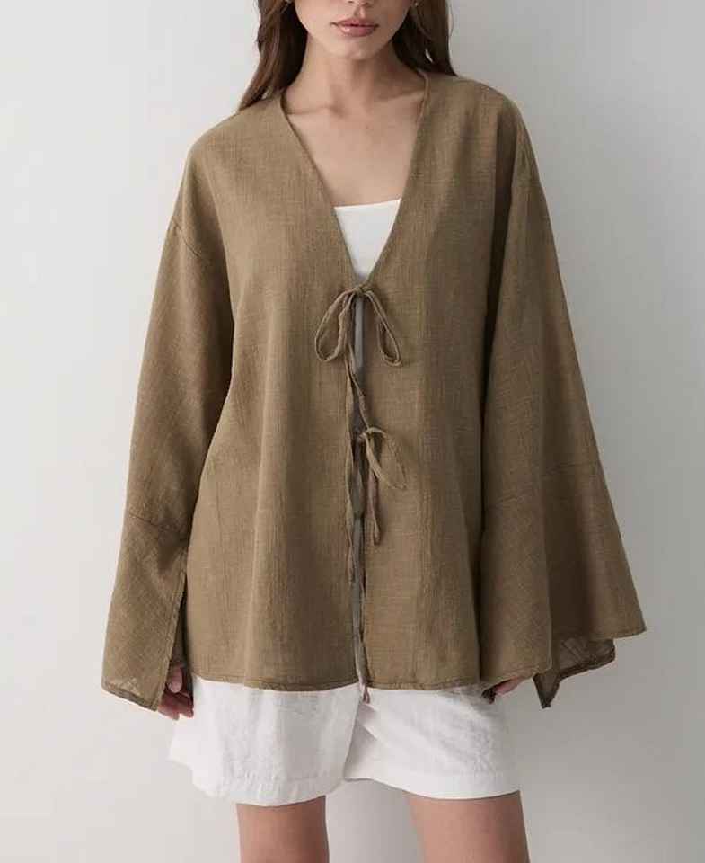เสื้อเชิ้ตผู้หญิงสไตล์วินเทจน่ารัก ผ้าลินิน 100% แบบไม่ทอ ย้อมสีพื้น ทรงห่อ คอวี ผูกเชือก แขนยาว ทรงหลวม