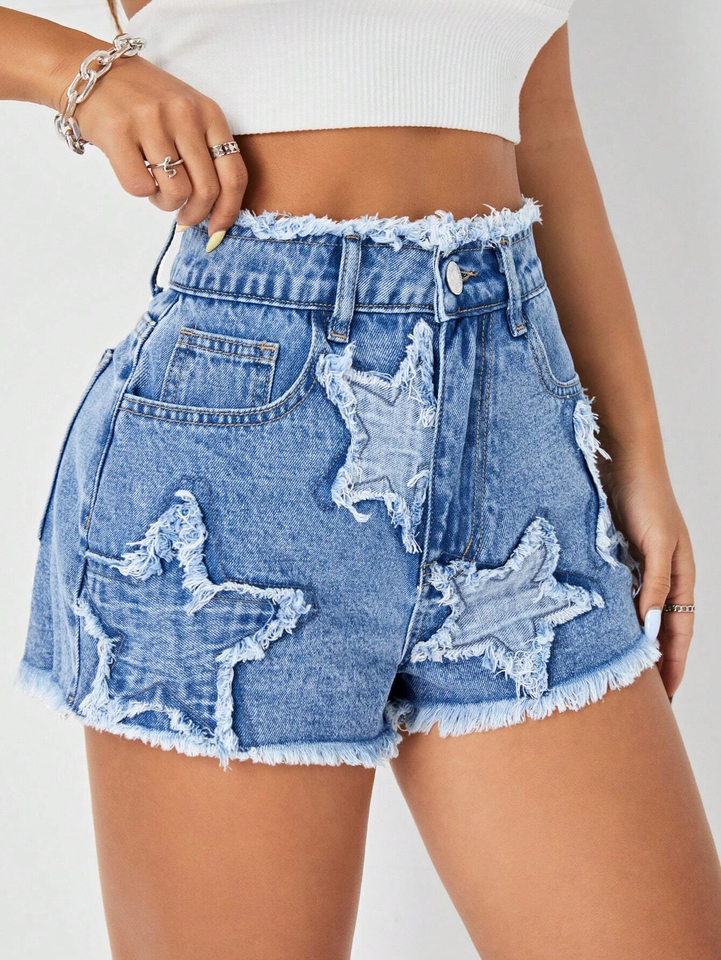 กางเกงยีนส์ขาสั้นเอวสูงสำหรับผู้หญิง แฟชั่นสุดเท่ ดีไซน์ขาดๆ พร้อมการฟอกแบบสโตนวอชเพื่อลุคทันสมัย