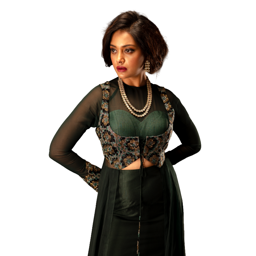 เสื้อคลุมผ้าชีฟองสีเขียวมรกตสำหรับผู้หญิง ดีไซน์เนอร์ ออกแบบสไตล์อินโดเวสเทิร์น ราคาดีที่สุด