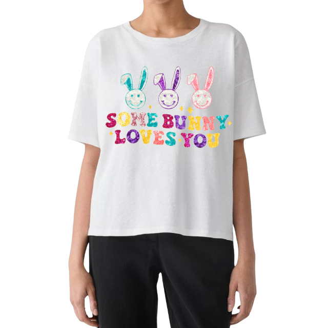 เสื้อยืดลำลองสำหรับผู้หญิงไม่ต้องกังวลเป็นแผ่นปะติดเลื่อมลายอีสเตอร์สไตล์อีสเตอร์ออกแบบได้ตามต้องการ