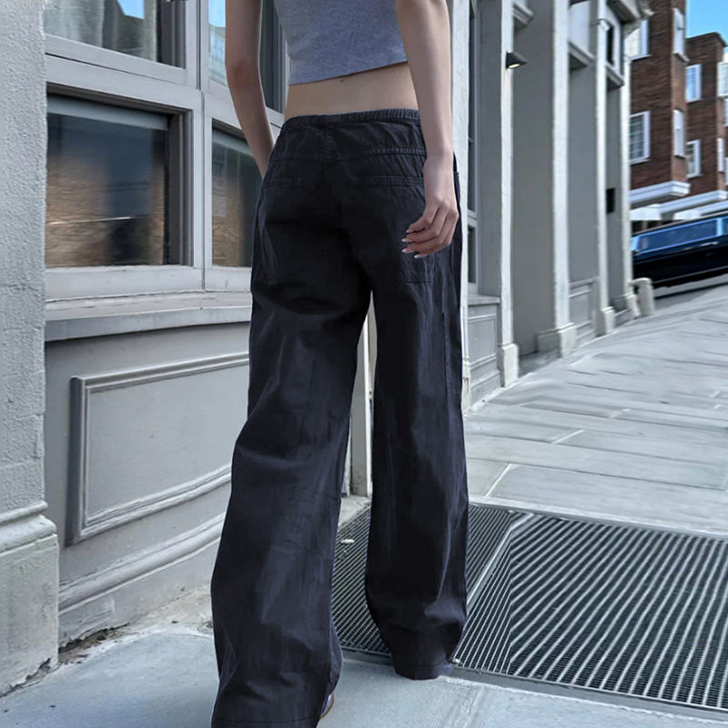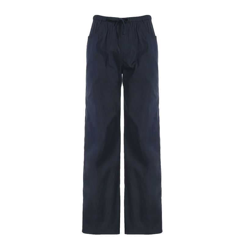 กางเกงขายาวทรงตรงสำหรับผู้หญิง มีเชือกผูกเอว แต่งกระเป๋า ผ้าทอ สีพื้น สวมใส่สบาย ทรงหลวม