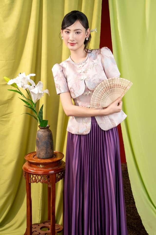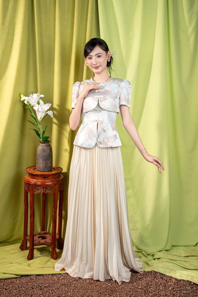 ชุดเดรสผู้หญิง KAMIKI เสื้อผ้าเวียดนามลายโบรเคดสำหรับพิธีการ พร้อมลวดลายภูมิทัศน์ - ดีไซน์เอวทรงเปปลัมสีงาช้าง สไตล์หรูหรา KPP20