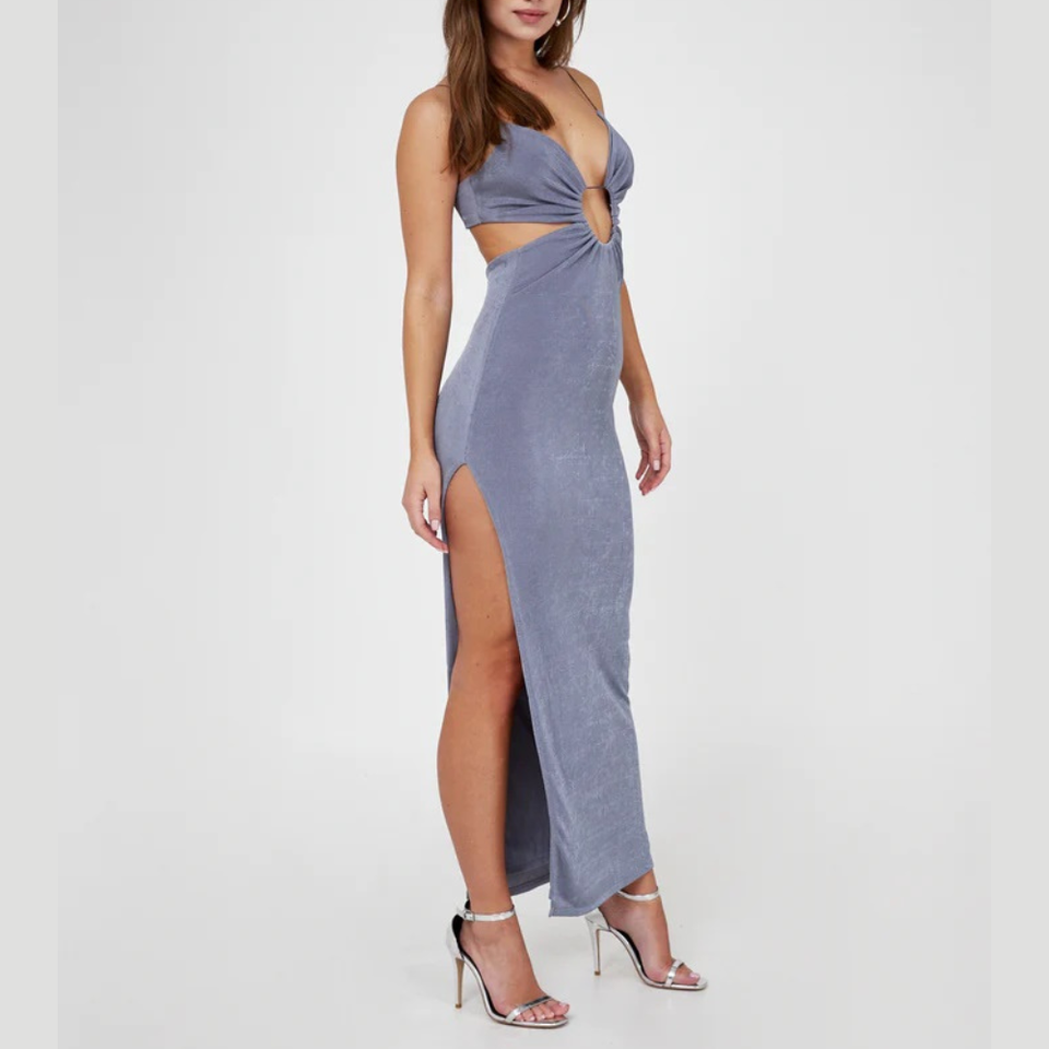 ชุดเดรสราตรีผ้ามันเงาสำหรับสตรีวัสดุยืดพร้อมหัวเข็มขัดแบบตัดทำจากเวียดนามเอวธรรมชาติเป็นมิตรต่อสิ่งแวดล้อม