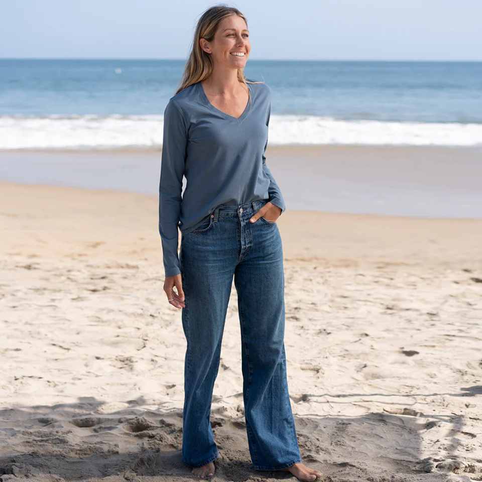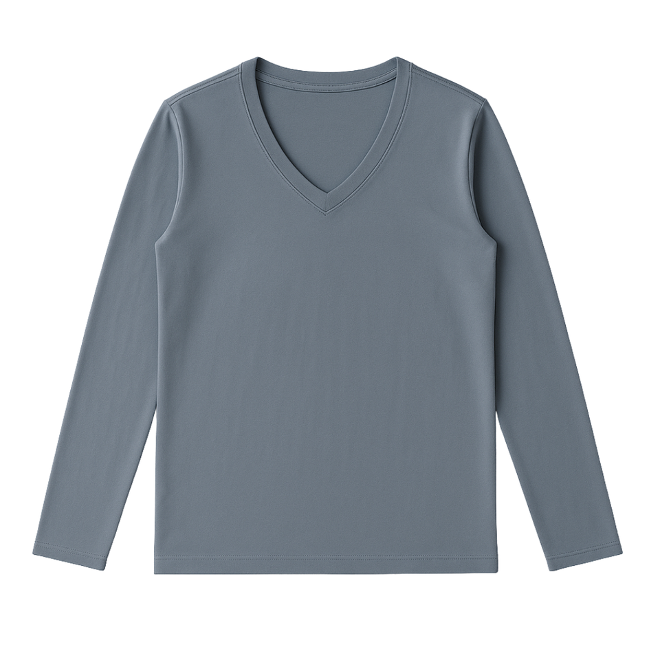 เสื้อยืดผู้หญิงสีน้ำเงินเข้ม แขนยาว คอวี ผ้าฝ้ายออร์แกนิค 100% คุณภาพพรีเมียม ผ่านการรับรอง GOTS ผ้าเนื้อนุ่มพิเศษ ทรงคลาสสิก