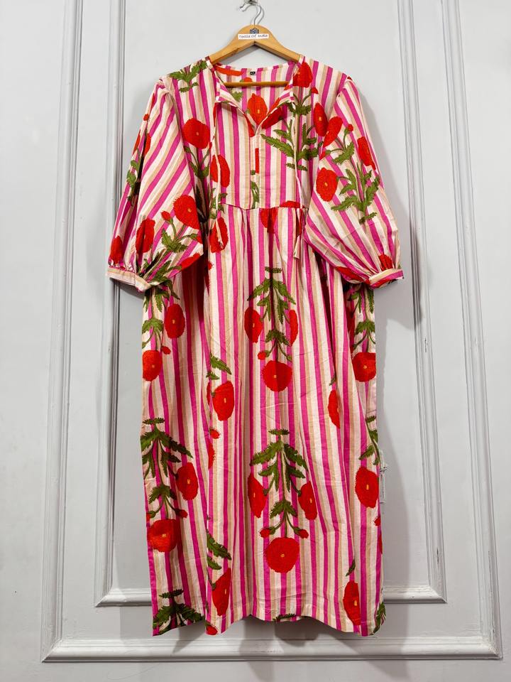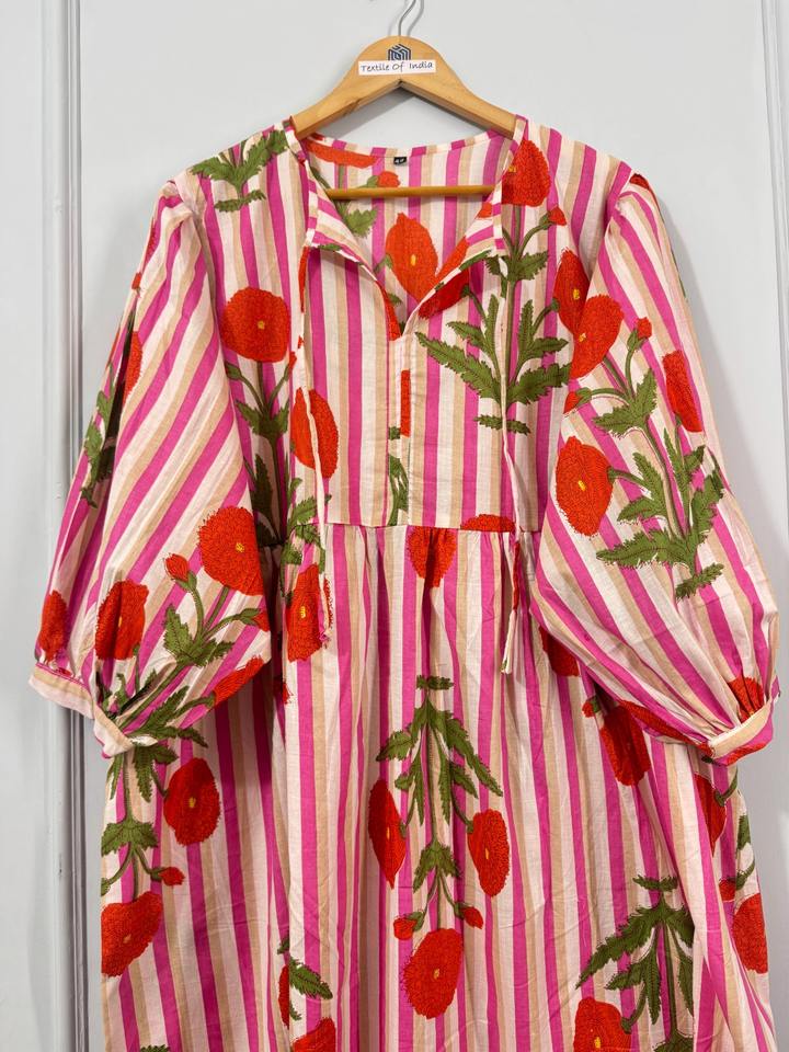 ชุดเดรสผ้าฝ้ายลายทางพิมพ์ลายดอกไม้สไตล์โบฮีเมียนทรงเอไลน์ ความยาวระดับเข่า ทำมือ ย้อมสีธรรมชาติ สำหรับผู้หญิง ใส่ได้ในฤดูร้อน เป็นมิตรต่อสิ่งแวดล้อม