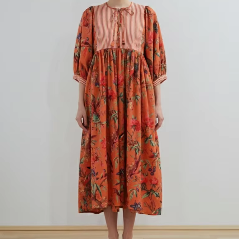 เดรสผ้าฝ้ายทรงเอลายทางเรียบง่ายแบบรักษ์โลกสำหรับผู้หญิง แขนพอง ความยาวระดับเข่า ทรงเข้ารูป สไตล์ลำลองสำหรับฤดูร้อน ดีไซน์แบบชาติพันธุ์ สไตล์บูติก