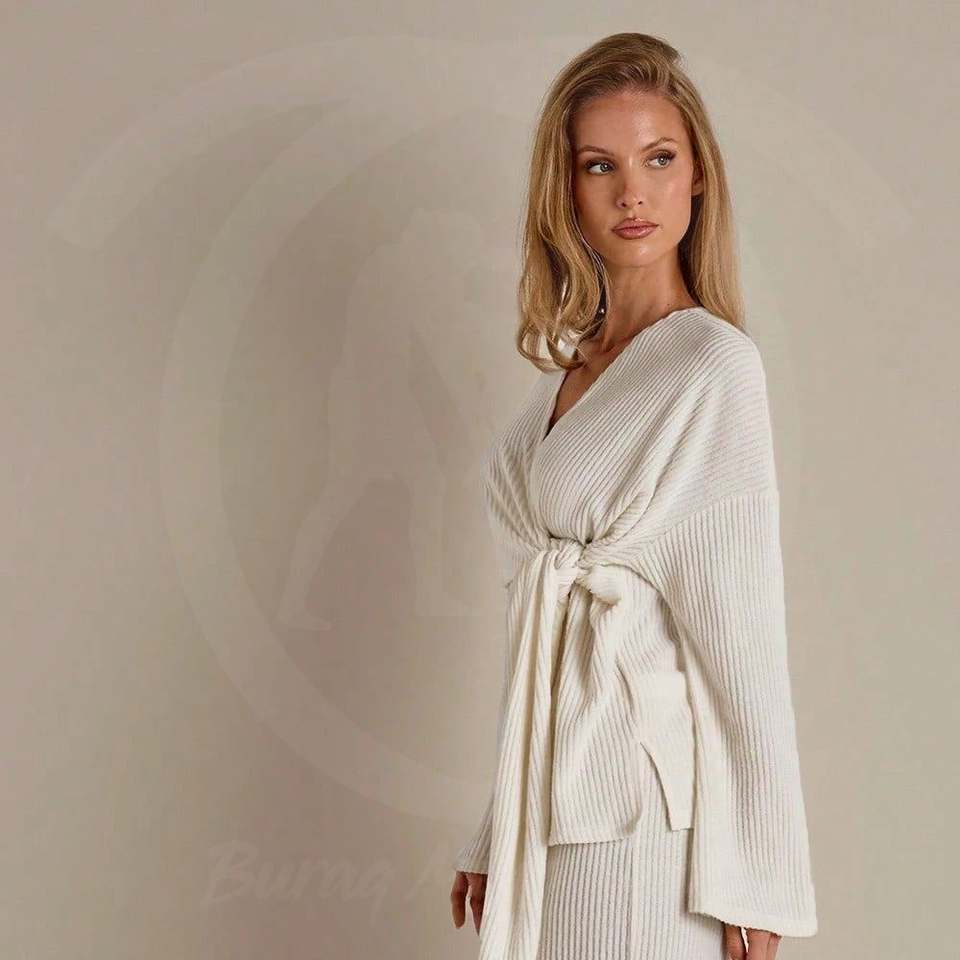 ชุดเซ็ตเสื้อถักไหมพรมแบบพันตัวและกางเกงขายาวสำหรับผู้หญิง สไตล์ลำลอง แขนยาว 2 ชิ้น