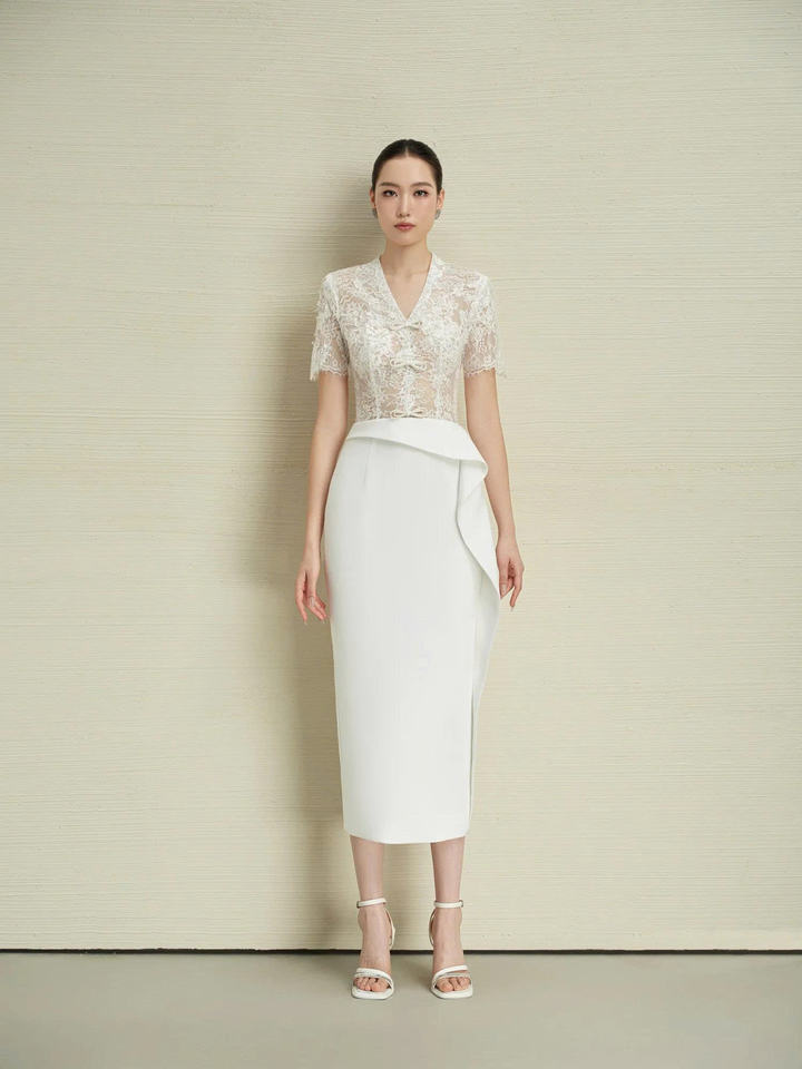 ชุดเดรสผู้หญิงผ้าลูกไม้โปร่งแสงและผ้าไหม ความยาวปานกลาง แขนสั้น คอวี รับผลิตแบบ OEM ODM งานฝีมือประณีต