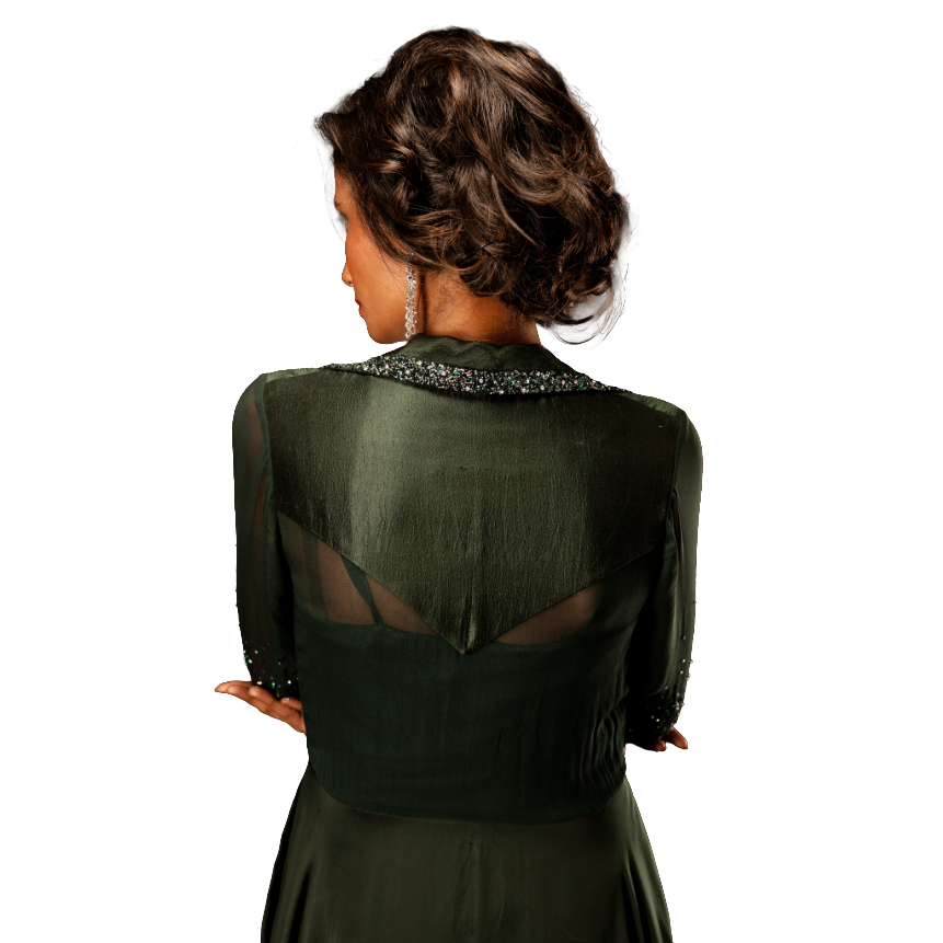 ชุดเดรสแจ็คเก็ตปักลายสีเขียวมรกตสำหรับผู้หญิง ชุดพรีเมียมสำหรับงานพิเศษและงานเลี้ยง