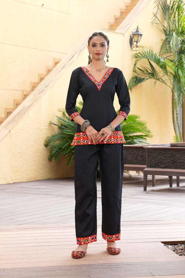 ชุดเซ็ต 2 ชิ้นสำหรับผู้หญิง ลายชนเผ่า สำหรับเทศกาลนวราตรี ผ้าถักเนื้อฝ้าย ระบายอากาศได้ดี คอวี แต่งงานปักลายกระจก