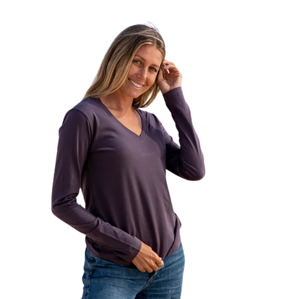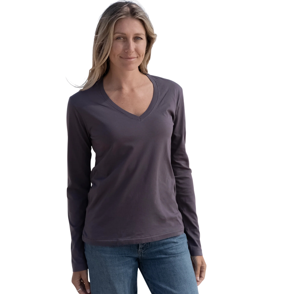 เสื้อยืดแขนยาวคอวีสีม่วงซีดสำหรับผู้หญิง ผ้าฝ้ายออร์แกนิคคุณภาพสูง 100% ผ่านการซักล่วงหน้า ได้รับการรับรองมาตรฐาน GOTS เนื้อผ้านุ่มพิเศษ ทรงคลาสสิก