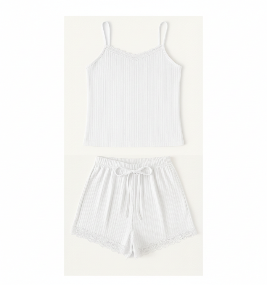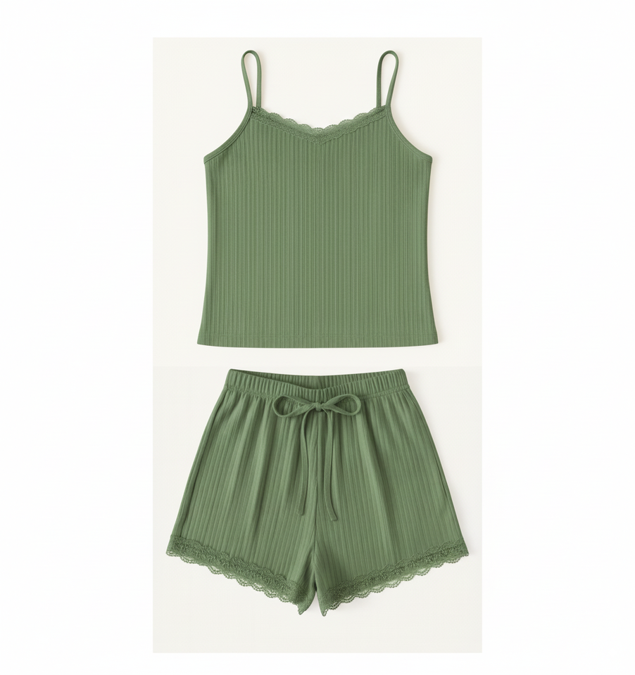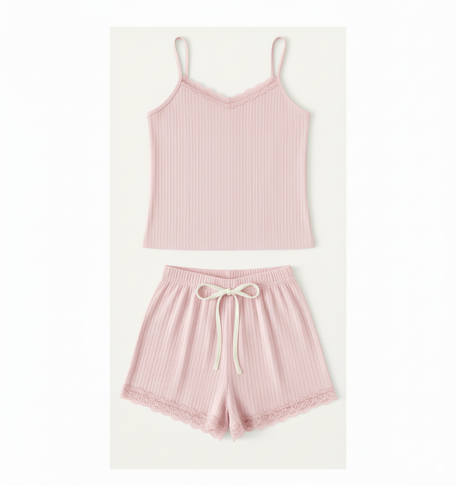 ชุดเซ็ตเสื้อกล้ามและกางเกงขาสั้นทรงสกินนี่เหนือเข่า ผ้าริบเนื้อนุ่ม น้ำหนักเบา สำหรับใส่เป็นชุดนอน รับผลิตแบบ OEM ODM จากโรงงานเสื้อผ้า