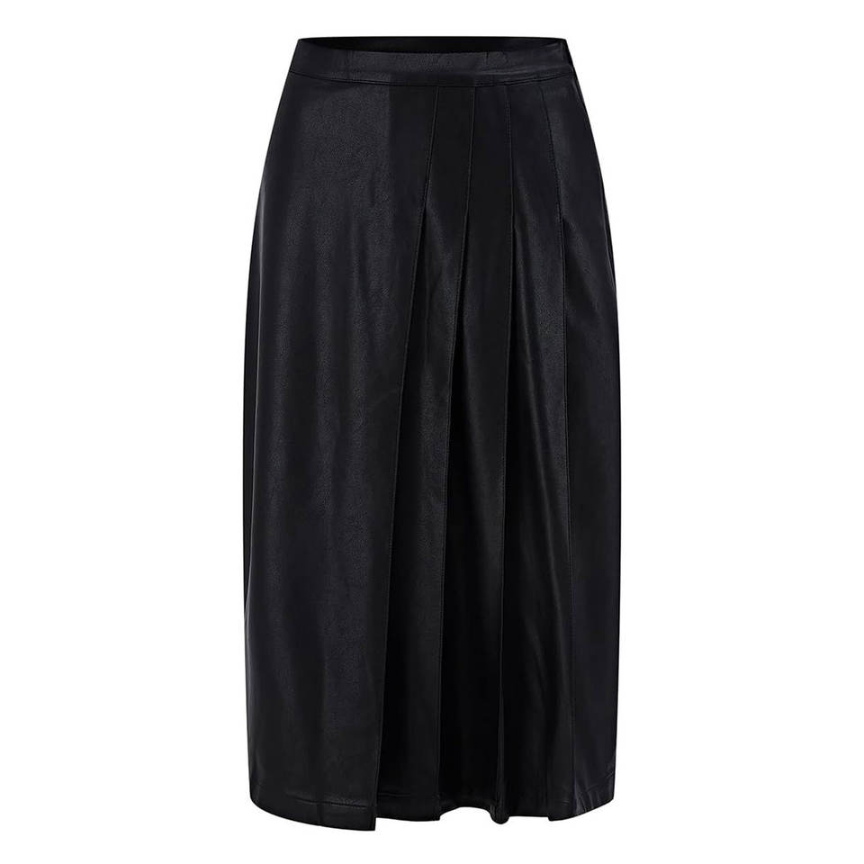 กระโปรงหนังเทียมเอวสูงสำหรับผู้หญิง, กระโปรงทรงบานทำจากหนัง PU อัดพลีทเอวสูงแฟชั่น