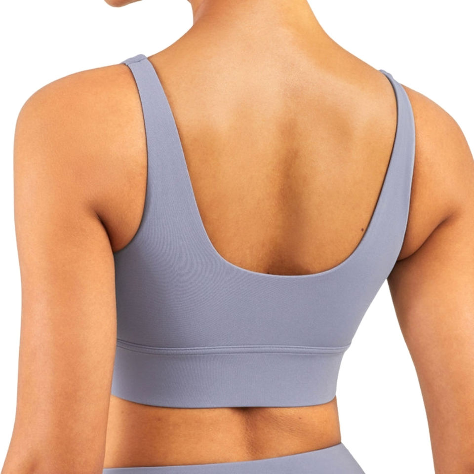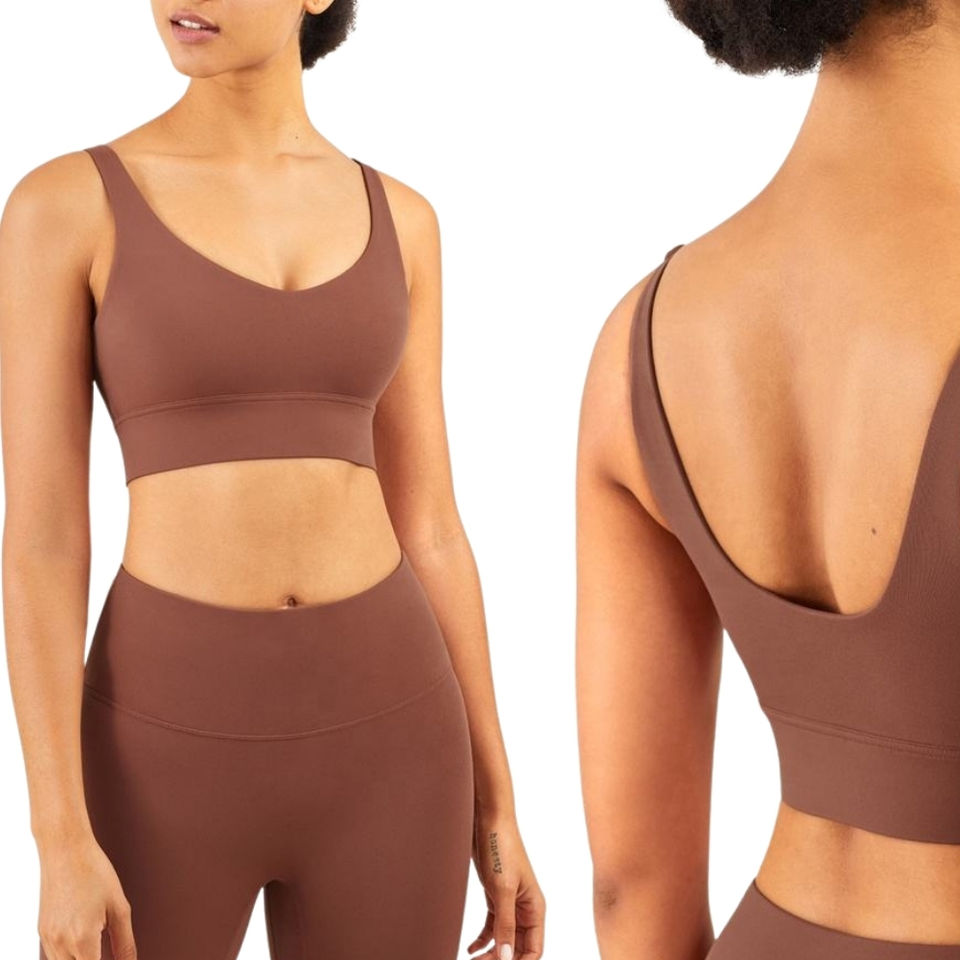 เสื้อชั้นในกีฬาผู้หญิง คอวี ดีไซน์หลังเป็นตัวยู ระบายอากาศได้ดี เหมาะสำหรับโยคะ พรีเมียม สวมใส่สบาย ยืดหยุ่น ทันสมัย ป้องกันแบคทีเรีย พร้อมโลโก้ด้านหน้า