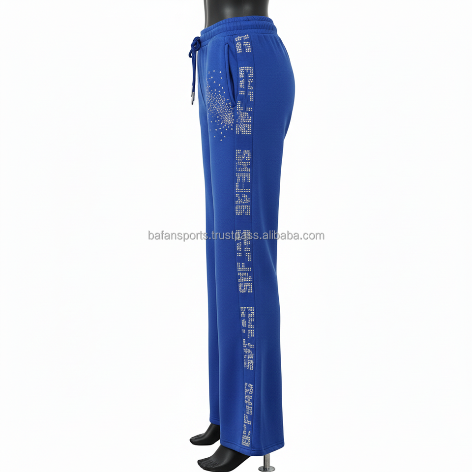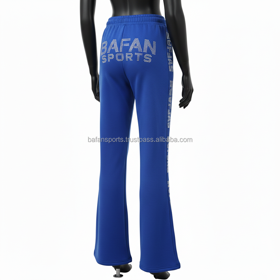 กางเกงขายาวทรงบานสำหรับผู้หญิง ผ้าโพลีเอสเตอร์เนื้อนุ่ม 300 GSM สีน้ำเงินกรมท่า แต่งกระเป๋าประดับคริสตัล พร้อมบริการสกรีนโลโก้ตามแบบ