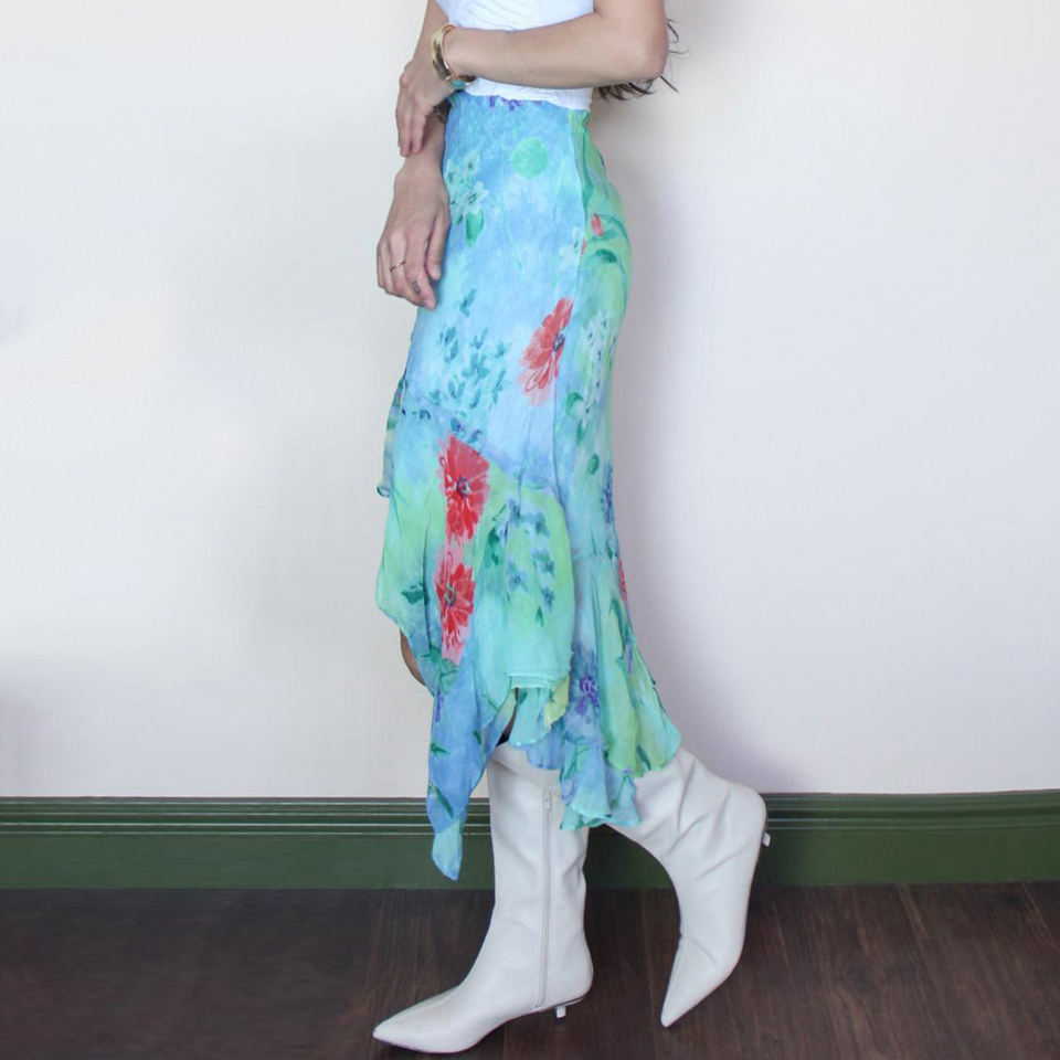 กระโปรงมิดิทรงเอพิมพ์ลายดอกไม้สำหรับผู้หญิง ผ้าตาข่าย ทรงเอไลน์ น้ำหนักเบา สไตล์ลำลองสำหรับวันหยุด แฟชั่นกระโปรง