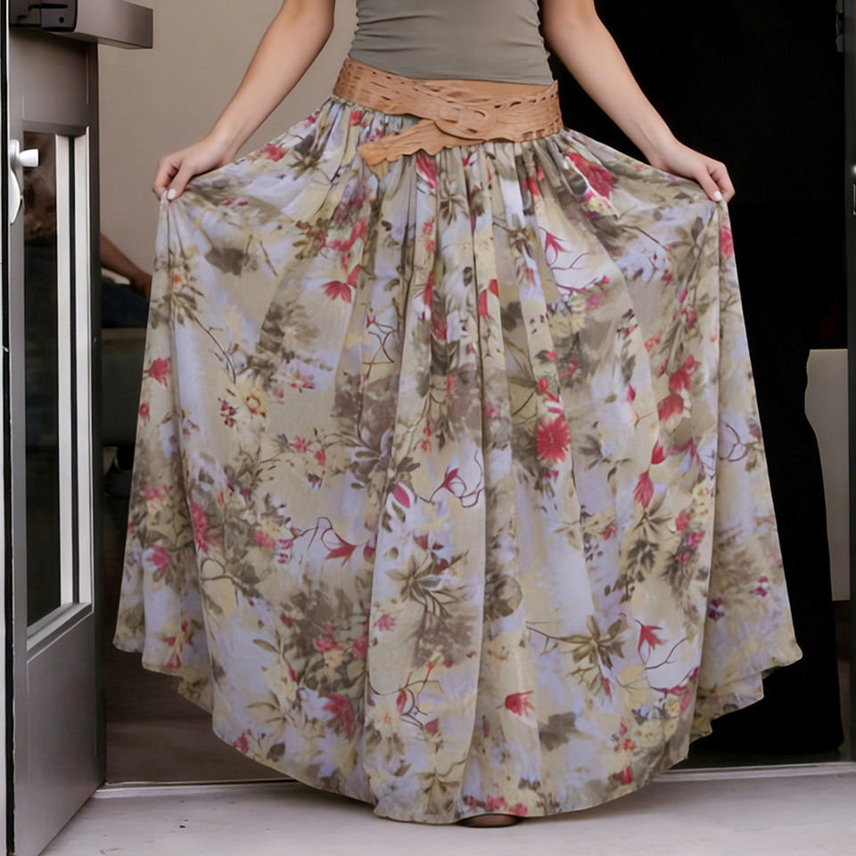 กระโปรงยาวลายดอกไม้ผ้าตาข่ายเอวสูงจีบพลีท กระโปรงยาวบางเบาสำหรับฤดูร้อน สไตล์โบฮีเมียน สวยสง่า