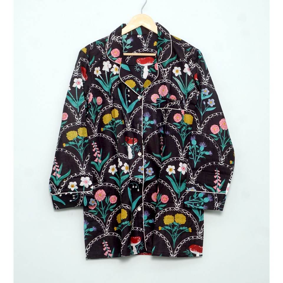 ชุดนอนผ้าฝ้ายลายดอกไม้สำหรับผู้หญิง เสื้อแขนยาว กางเกงขายาว ชุดนอนเข้าชุด