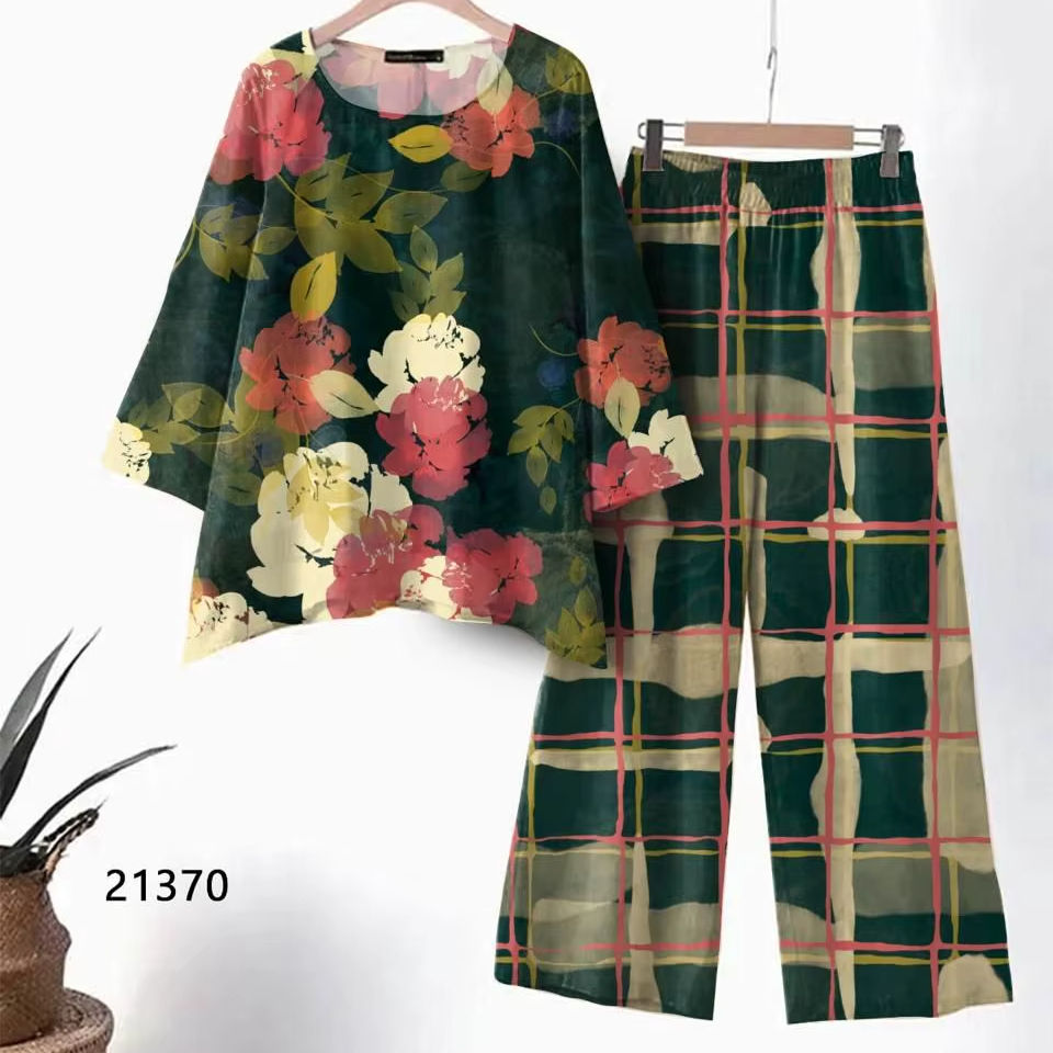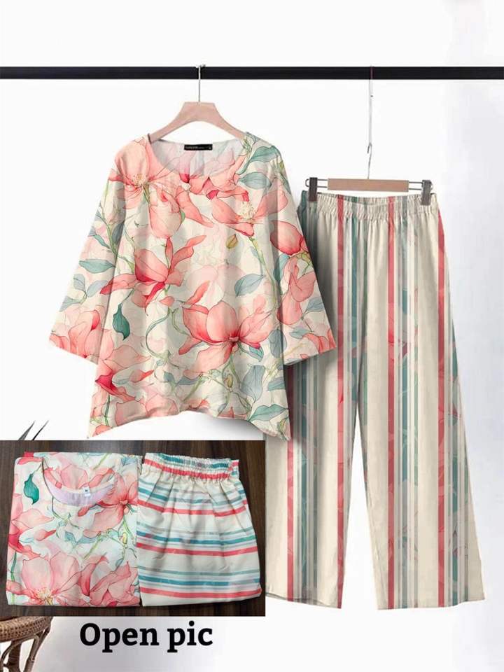 ชุดเซ็ตผ้าโพลีเรยอนพิมพ์ลายดอกไม้สำหรับผู้หญิง เสื้อและกางเกงขายาวทรงปาลาซโซ่ ชุดลำลองสองชิ้น